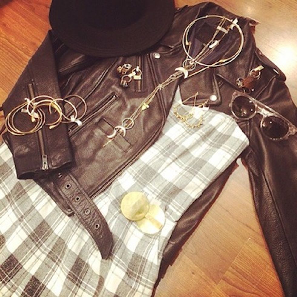 // Azalea strapless jumpsuit ($89); Neuw Denim leather jacket ($659); Komono sunglasses ($60); Olive & Pique hat ($48); Pamela Love crescent moon ring ($190), silver star/moon collar ($250), and lariats ($190-275); Vanessa Mooney earrings ($87); AK Vintage gold necklace ($82); Lauren Wolf star ring ($64) and spikey ring ($97); Stone Unearthen rings ($106); Faris circular bracelet ($195); Fay Andrada thin gold bracelets ($129/set of three); Soko gold collar ($81) and cuff ($58); and Circadian Studios cuffs in gold ($122), rose gold ($124), and brass ($38); all available at Azalea (Hayes Valley), azaleasf.com.