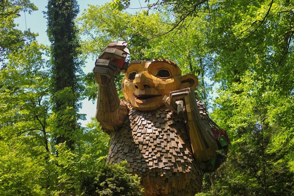 Snuggled among the trees around Filoli’s outerlands, the monumental creatures are meant to inspire environmental stewardship at a time when much of the country’s public lands are under threat of deregulation. But this isn’t the first time Dambo’s trolls have been sighted. Since 2014, he’s erected his fairytale mascots—each made from reused and repurposed materials—in parks and open spaces around the world, from Copenhagen to Miami to China. He’s also the creative mastermind behind Future Forest, a 5,000-square-foot jungle made of plastic waste in Mexico City’s Chapultepec botanical garden; a traveling Happy Alphabet and Happy Wall that let visitors write and draw messages; a “secret” Stone Circle where Dambo’s trolls allegedly meet every 211 years around the firepit; and other interactive exhibitions that are as silly as they are poignant.