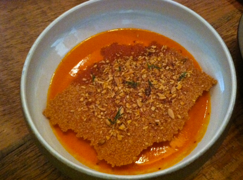 Another highlight was the sweet Italian red pepper soup ($9), a shock of red at the table with the bold, slightly smoky, ripe red pepper flavor to back it up. It's topped with a super-thin pan de mie crouton and almond tuile, both of which invitingly melt into the soup as it sits at the table.