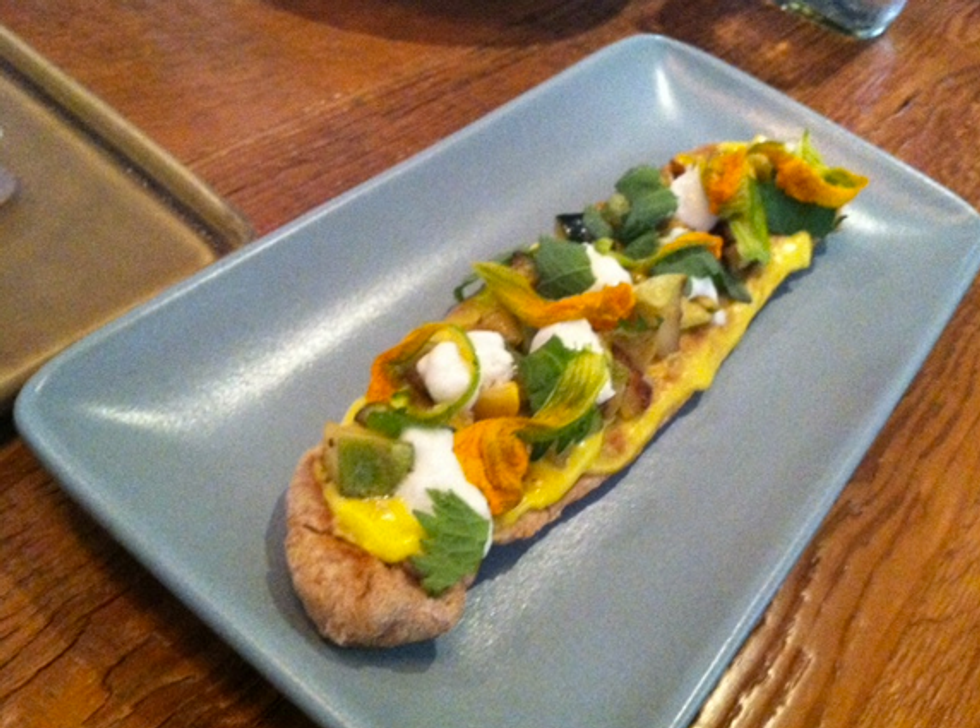 Even though there's a $4 charge for the bread, order it. The housemade wild fennel levain with churned butter has so much character it puts Acme to shame. There's also a seasonal plancha bread ($12), which is like a thicker oblong piece of whole wheat naan, topped with creamy yellow squash puree and finished wtih squash blossom ribbons, slivered shiso, chunks of burrata and roasted squash.
