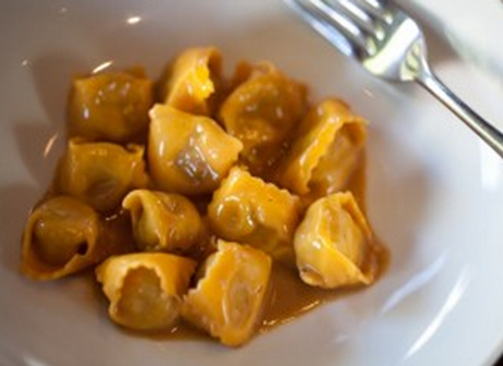 It was fear of missing out that propelled me into the restaurant, but before even lifting a fork, I felt transported. Renaissance-style murals on the ceiling and upper walls, and an expansive light marble bar conjure the grandiose all-day cafes that stud Italy's major piazzas. It's done in a way that feels right—not hokey. Fresh-baked foccacia, a grassy, peppery Italian olive oil and a wine list chock full of obscure Italian grapes continued to prime our palates for the highly anticipated agnolotti.