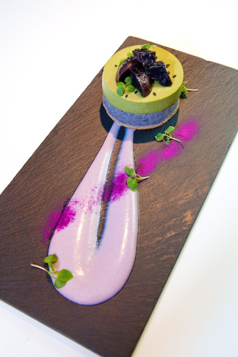 Using sweet potato powder and green tea powder, Brasserie S&P has created a delicate plated dessert with Hana Green Tea Mousse, Purple Yam Genoise and Candied Purple Potato.