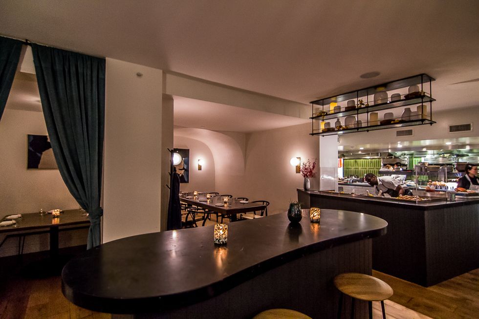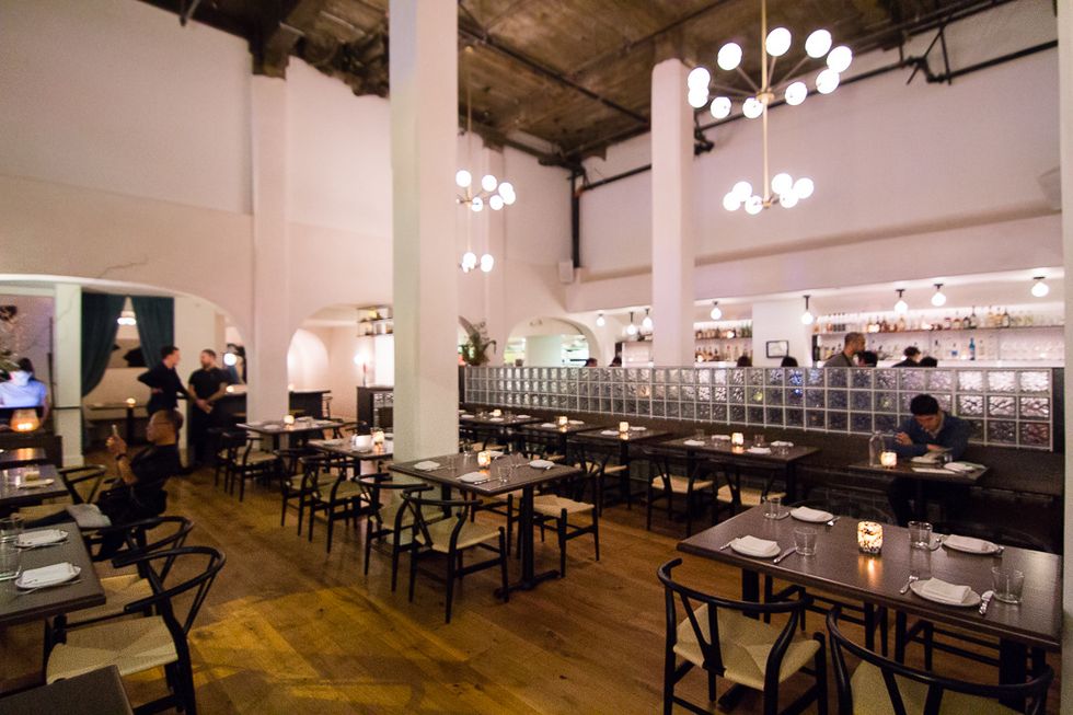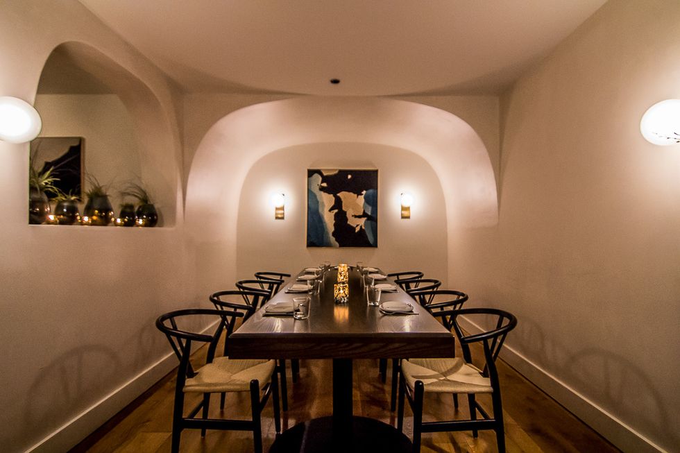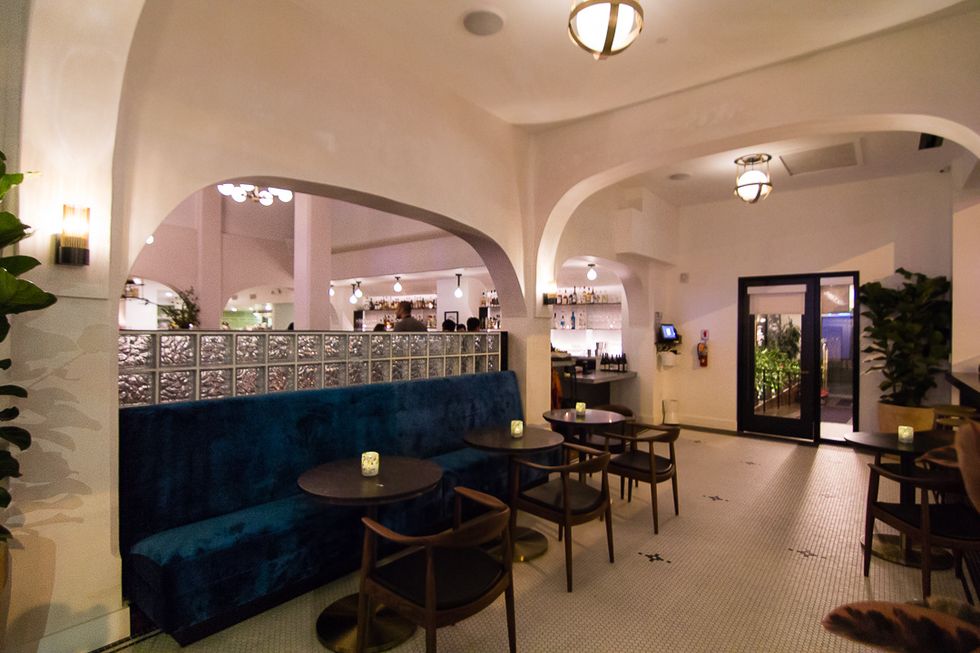 But first, we've got to hand it to Ayala for making a worthy dining destination in the treacherous landscape that is downtown SF: crammed with shoppers and aggro commuters, the workaday neighborhood isn't exactly the quaintest spot for a meal. But the corner restaurant inside the stylish boutique stay invites us to feel at home with multiple spaces to chill, whether you prefer standing to slurp down a snack and a drink beneath the arched ceilings of the raw bar or flopping into velvet banquettes in the "oysterette" lounge. The main dining room was designed in shades evocative of the ocean, and to soothing effect, with intimate two- and four-top tables lit by retro-modern globe pendant lights.