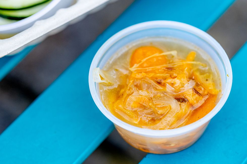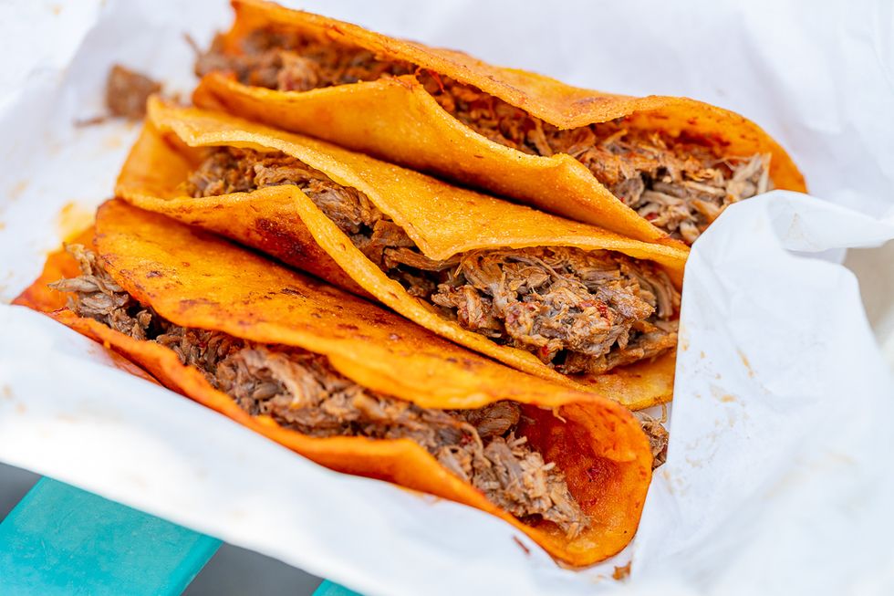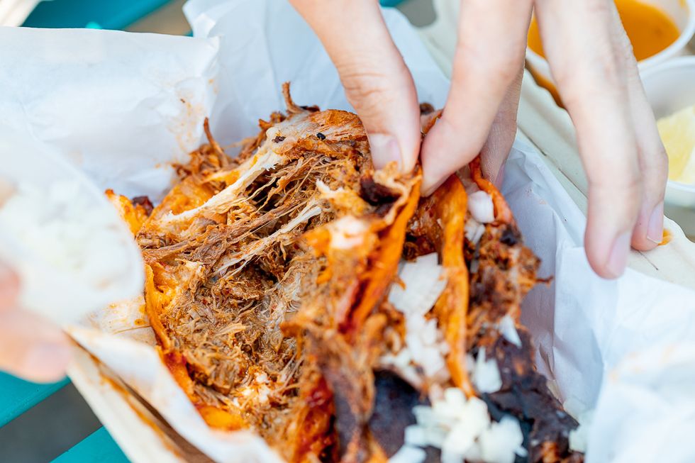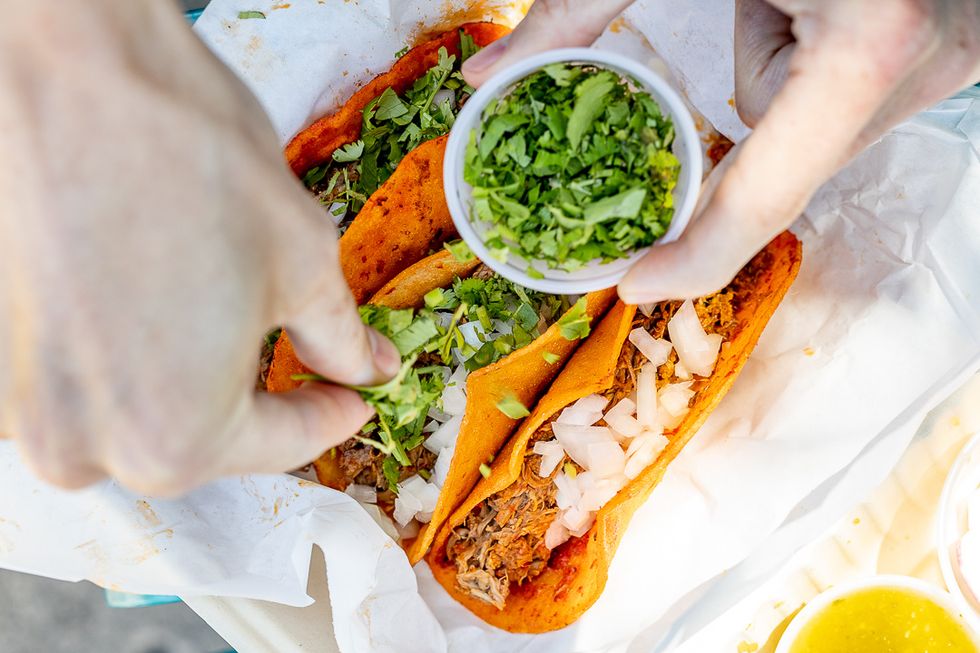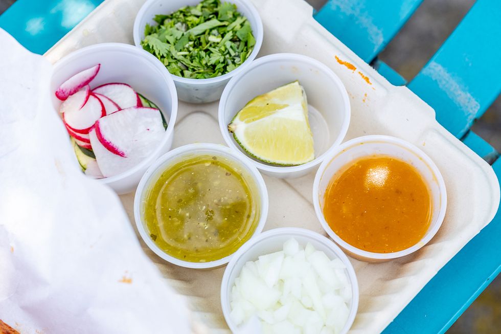 Indecisive types will do well here since there are basically only two options: quesabirria tacos or plain birria tacos, both sold in threes. The latter comes sans the melted mozzarella cheese; both come with diced raw onions, cilantro, lime, radishes, and two salsas—"kinda spicy" and "hella spicy." Live for hella spicy foods? Add on a free portion of pickled habañero to kick things up a notch.