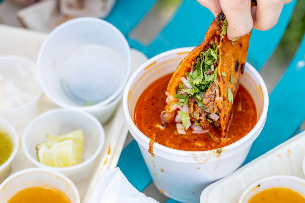 Your only other pressing decision is whether to go for the consome, a steaming cup of red dipping broth swimming with birria chunks. Do it. In the end, your hands will be running with birria juice and cheesy grease—and you will like it.