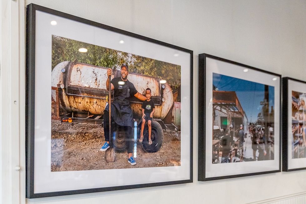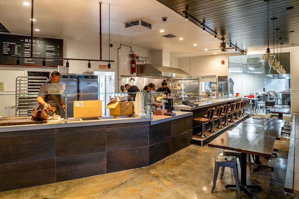 The brick-and-mortar restaurant, nearly a year-and-a-half in the making, is now the East Bay's It new spot. An epic mural of a steer by Oakland artist Steven Anderson signals the black-painted facade. Inside, the walls tell the story of Horn's rise to success, hung with photographs of his family, his achievements, memories, and newspaper articles. Hair-on-hide stools pull up to the counter, at one end of which is the restaurant's stage of sorts: the custom-made indoor smoker—the first indoor smoker in the state of California—where meaty magic happens.