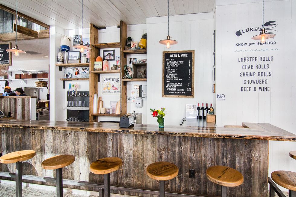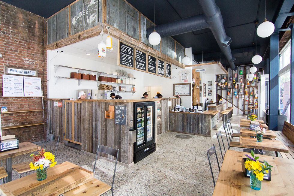 The spot is fast-casual with order-at-the-counter service, but the interior has an inviting nautical theme with exposed brick walls illustrated with fishing boats, hanging buoys, and floor-to-ceiling windows to let the light in. A small bar area with high-top stools is well suited to happy hour, which serves up plenty of specials including a platter of lobster tails and discounts on wine and beer.