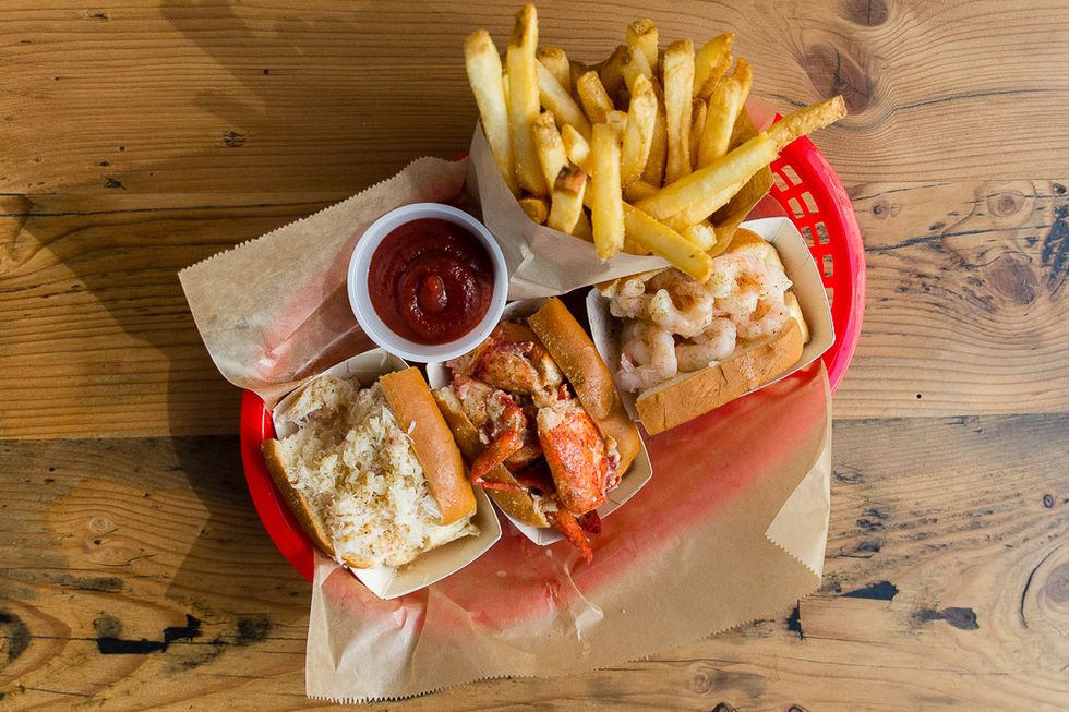But the bottom line is this: The menu may be better than you'd expect. On offer are plump and juicy lobster, shrimp, and crab rolls on split buns that are lightly toasted and brushed with melted lemon butter, mayo, and secret spices. There's also chowder and a mix of sides, including fries and Cape Cod chips.