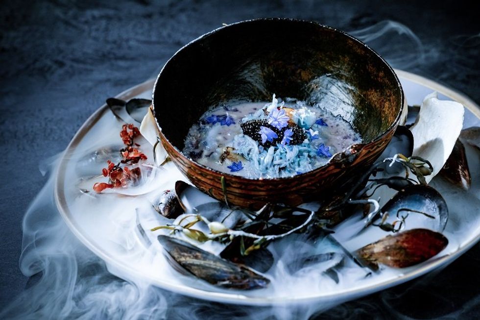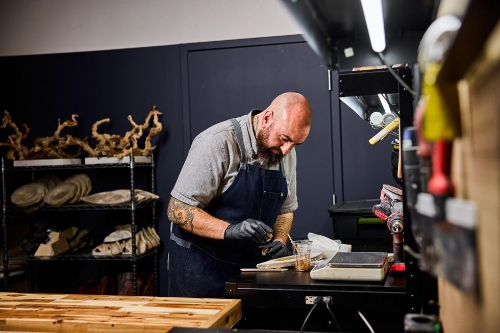 We start with gold in Shelton’s workshop, getting a behind-the-scenes look at the tools and materials employed in the process of creating the meal’s artistic foundations. On a concrete plate imprinted with a fresh corn fossil painted gold, he skewers aebelskivers, puffy Dutch pancakes filled with buttered corn pudding and garnished with caramel popcorn. Then it's on to the wine room for a sparkling pink welcome, a carbonated, clarified watermelon gazpacho floating with goat cheese pearls.
