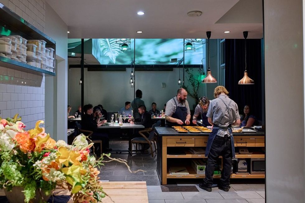Although there’s 4,500 square feet to play with here, the team has kept each of its two nightly seatings to just 12 people, creating a shared experience just as intimate as it was on Fillmore. After an amuse bouche in white (coconut poached sole, water kimchi radish, and smoked creme fraiche snow), the projectors light up. As they serve the green course, a baby pea salad with green goddess dressing bursting from an edible flower pot, the lights shift to emerald and grass grows from seed to stem on the wall above us.