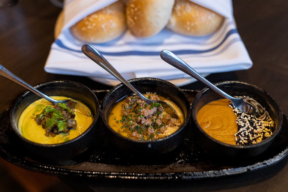 Few things are more satisfying that hot and puffy Moroccan sesame rolls served with delicious things for dipping. From left: Cauliflower curry; butter beans with merguez sausage crumbles; and chickpea saffron with sesame seeds.