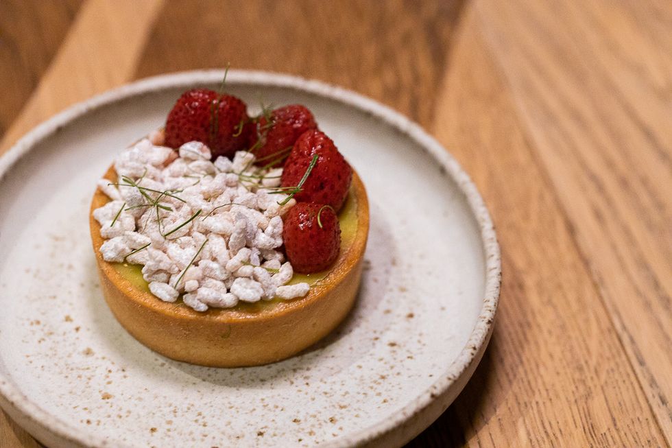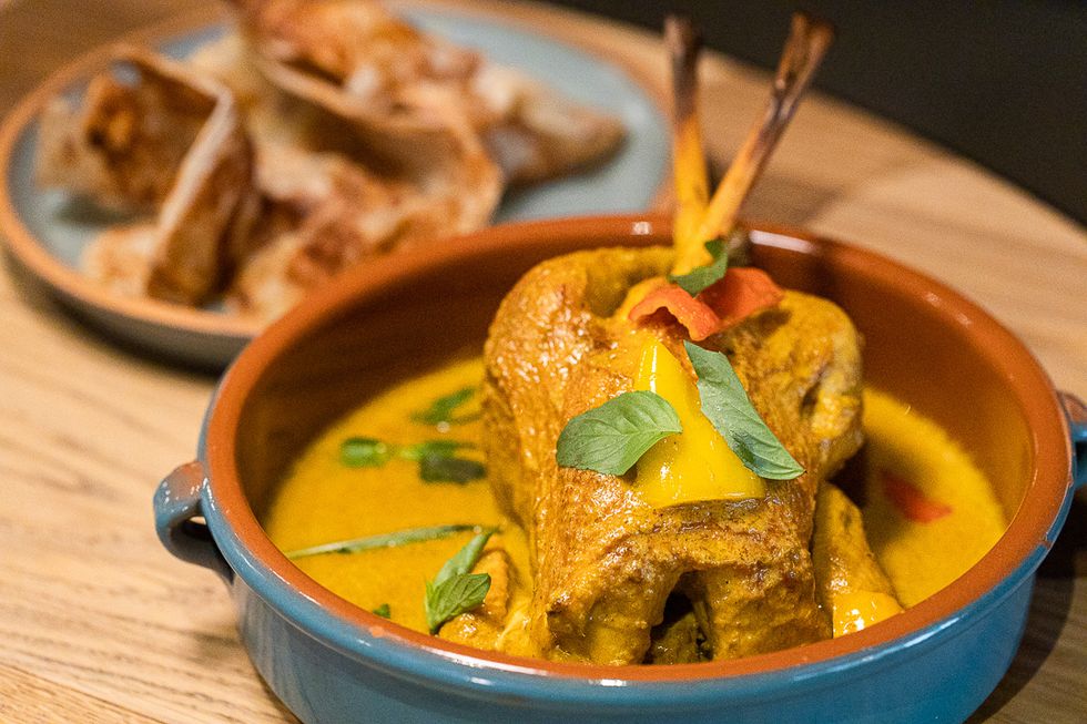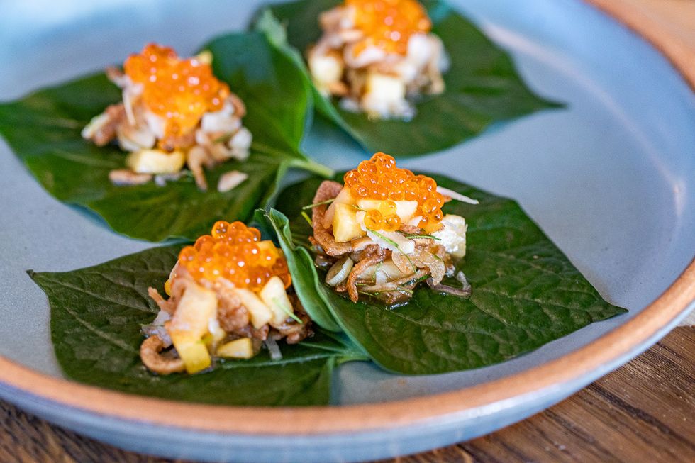 The interior is also decidedly more polished than Kin Khao's. Kitted out by Lundberg Design, the aesthetes behind the interiors at Mourad and Quince, Nari is modern and elegant—an open two-story space with floor-to-ceiling windows that shed light on lush ferns and trendy monstera growing up between half-circle booths upholstered in exquisite floral fabric. In Lundberg fashion, there is thoughtful woodwork and sculptural fixtures.