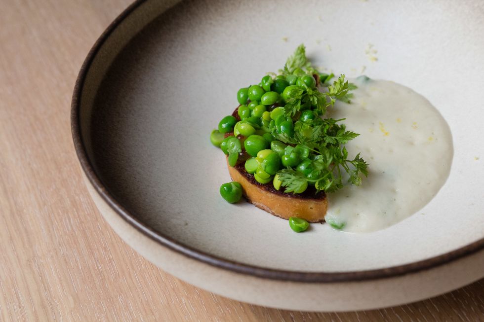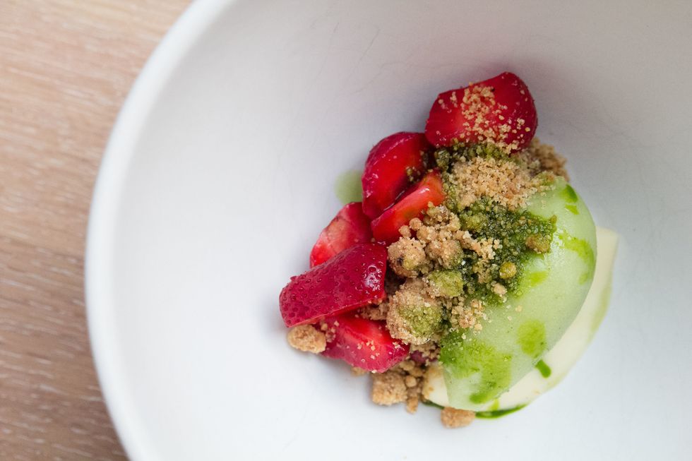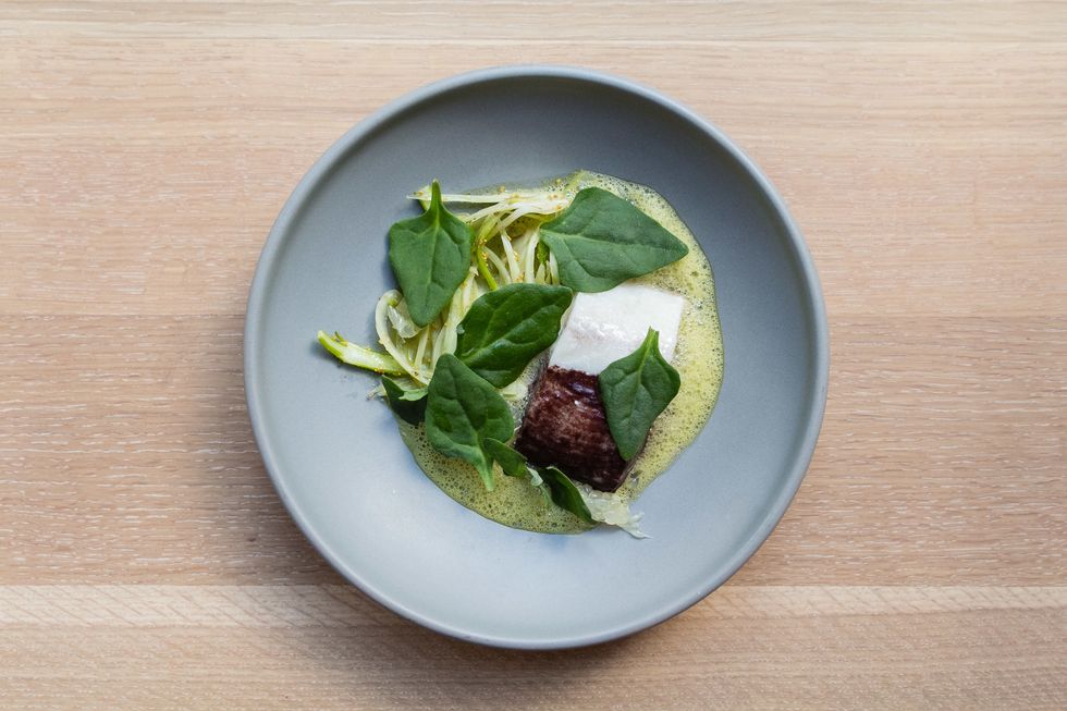 You'll be met with a marble-topped bar, which contrasts against the building's original exposed brick walls and graphic black-and-white tiled flooring inspired by classic French bistros. If you don't yet feel welcome, take a few more steps in and witness the work of hospitality happening live in the open kitchen; the 34-seat dining room, designed in neutral hues and warm lighting by Studio BBA (Flora Grubb Gardens, Stonemill Matcha), is also inviting.