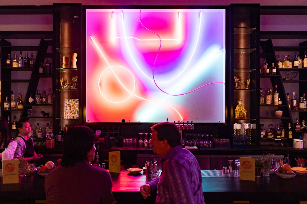 The vibrant space was designed by another big name you'll recognize: Brandon Jew—yes, of Michelin-starred restaurant Mister Jiu's—and Anna Lee of Soon and Soon Studio, which also designed Mister Jiu's as well as Moongate Lounge and the just-opened Mamahuhu. The theme: Hong Kong nightlife meets the dramedy film ChungKing Express meets 1990s R&B record covers. A series of neon light sculptures custom created by SF-based artist Laura Stevenson are an abstract interpretation of the zig-zagging lights of Hong Kong as seen at night from above.