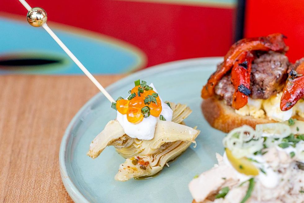 The new eatery breathes life back into the old Caffé DeLucchi space, which closed in 2018. The first thing you'll notice: the vibrant exterior, which has been hand-painted with an abstract motif of flowers and SF Victorians in tropical hues. Two parklets, painted in bright peach and aqua tones, are ready to seat 100 guests for outdoor dining in an energetic atmosphere.