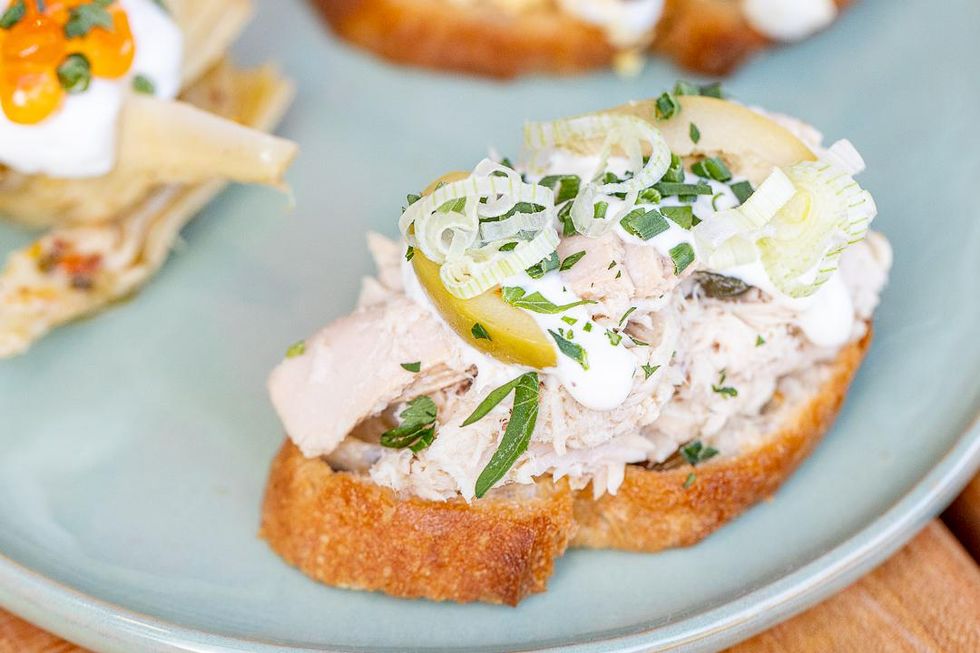 The menu features several bite-and-a-half-sized pinxtos, incuding this crostini topped with housemade blood sausage, hard-boiled egg crumbles, and red peppers.
