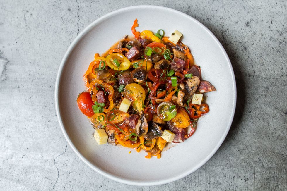 Big heaping bowls of fresh ingredients blend together a selection of the essentials: veggies, cheese, olives, nuts, and meats in oils and vinegar—honestly, there's nary a leafy green in sight.