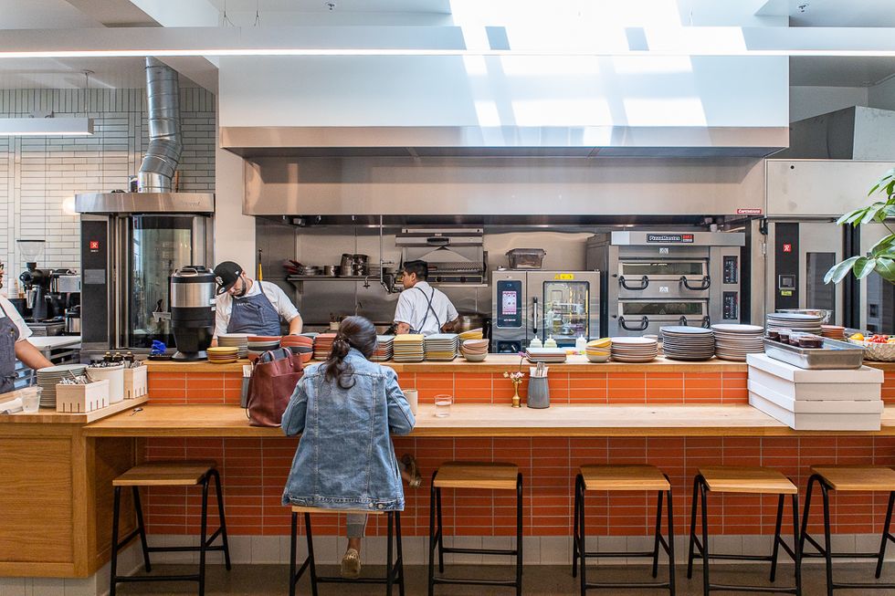 While the front area and middle space of the bakery may feel busy and bustling with crowds, if you make your way to the back you'll find a bit of breathing space at the high-top stools facing the open kitchen.