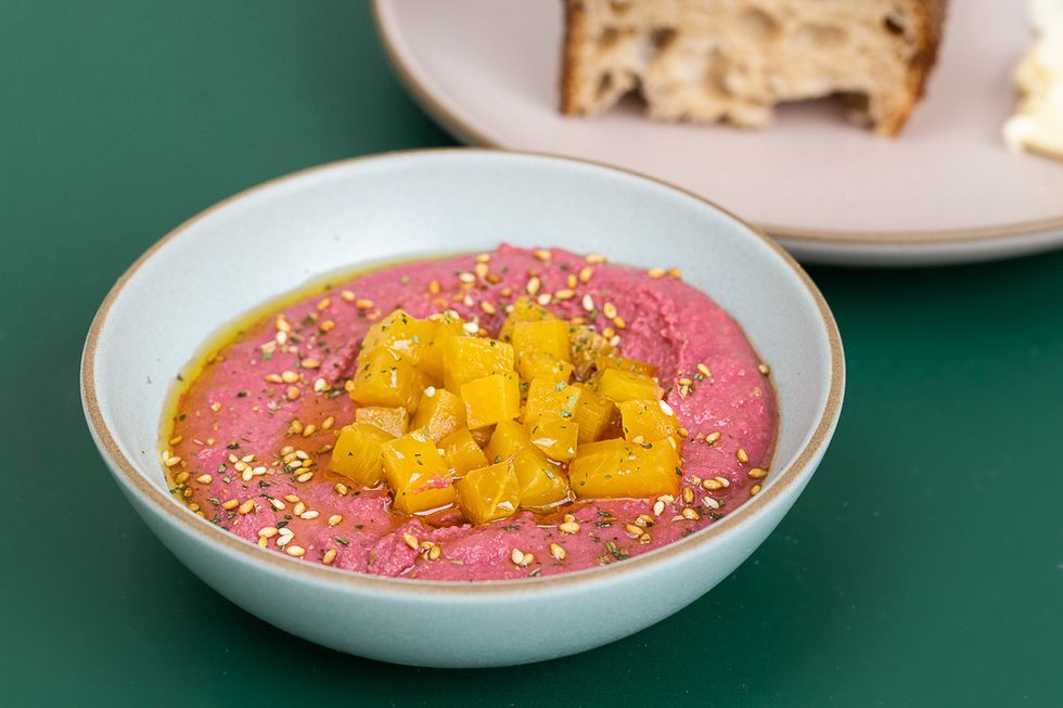 Once the lunch hour hits (read as early as 11am on Tartine time), the menu adds a slew of other dishes. The country bread offers is served with three different pairings: goat cheese, fermented veggies, or this cheery pink dip. It's a blend of beets and chickpeas for a savory hummus, topped with root top gomashio (aka un-hulled toasted sesame seeds).