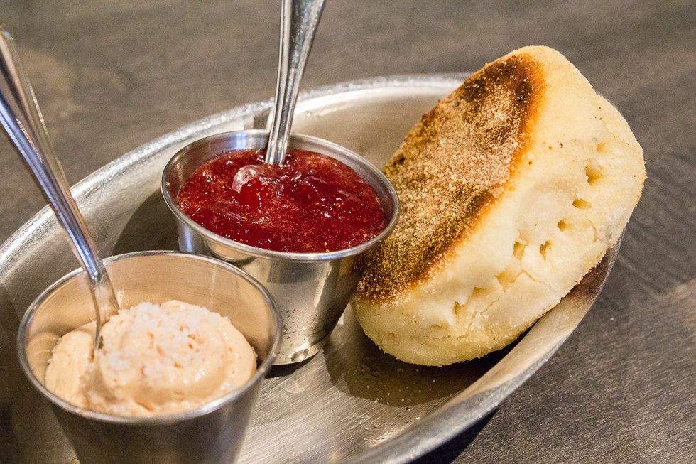 The housemade English muffins are like none you've ever had, teamed with whipped foie gras and Swanton Berry Farm's strawberry jam. In the morning, these muffins also make delightful breakfast sandwiches.
