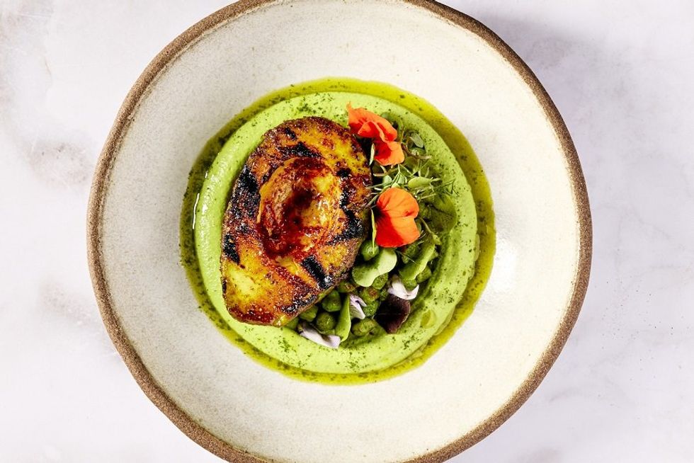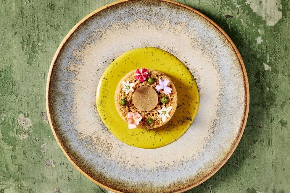 The meal begins boldly, with cocktails with a culinary twist. I’ve never quite had anything like the North Beach, a martini that involves infusing sourdough starter and parmesan cheese with liquid nitrogen over 48 hours. It’s tangy and bright, like bruschetta in cocktail form. My partner goes with a Castro Valley, a hearty, spirit-forward bourbon drink made with BBQ clarified butter and heather honey that is sweet and bitter and June-gloom cozy.