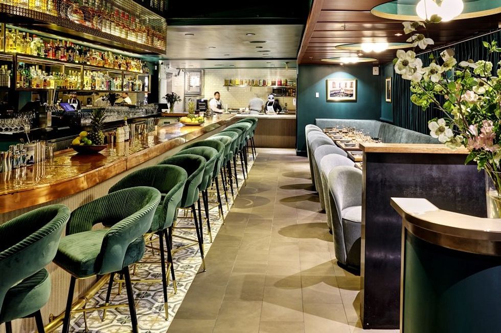 The new restaurant slipped seamlessly into the space, which revolves around a show-stopping bar with a swanky midcentury vibe. Tropical greens and blues, tones evoking eastern India’s native parrot, dominate the back dining room where the wallpaper is covered in birds and colorful blooms, and oversized velvet booths line the wall. A glass-walled wine cellar and Victorian-inspired metallic ceiling tiles are elegantly incongruous with the bar’s mosaic tile floor and framed works by Indian artist Saurav Das.