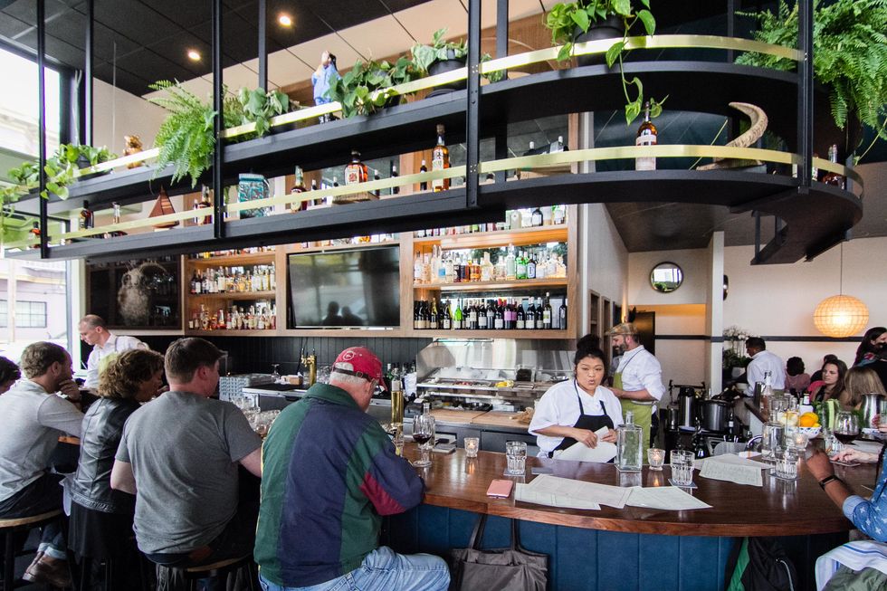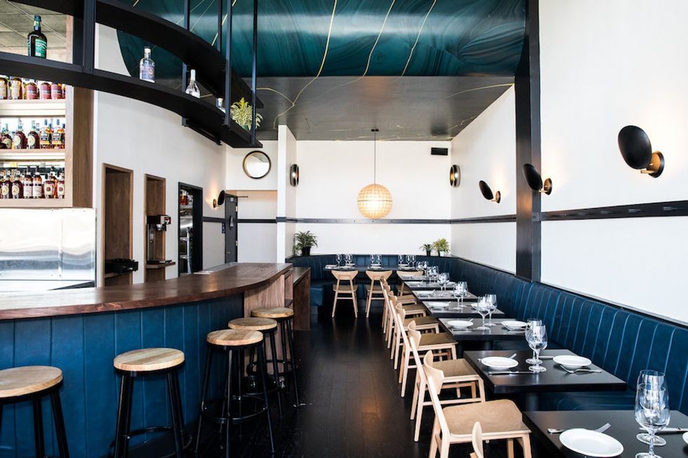 At the corner of Clement Street and 24th Avenue, the tavern delivers a moody take on the aquatic theme thanks to M-T Space designer Melinda Turner (the same interiors savant responsible for that Instagramable wallpaper at Fiorella), who installed deep aqua leather booths and a faux-malachite ceiling accent for subtle oceanic effect. Black and gold fixtures keep the look modern, and the walnut wraparound bar is plenty warm for an intimate catch-up sesh over heaping platters of fruits de mer.