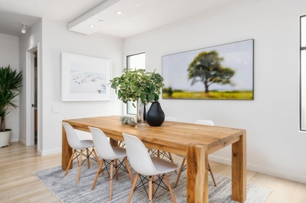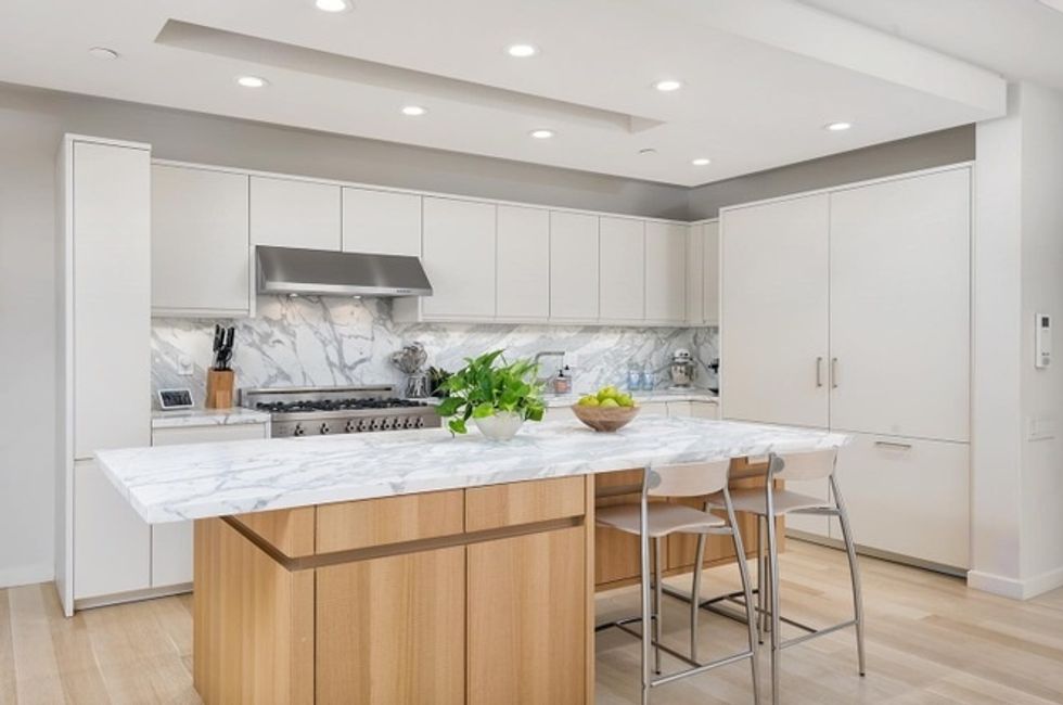 The kitchen, dining room, and living room come together in an open floorplan for easy mingling; on nights when there's entertaining, sliding glass doors here open onto the al fresco cooking area. The interiors include such polished finishings as Calacatta marble and custom Liecht cabinets in the kitchen.