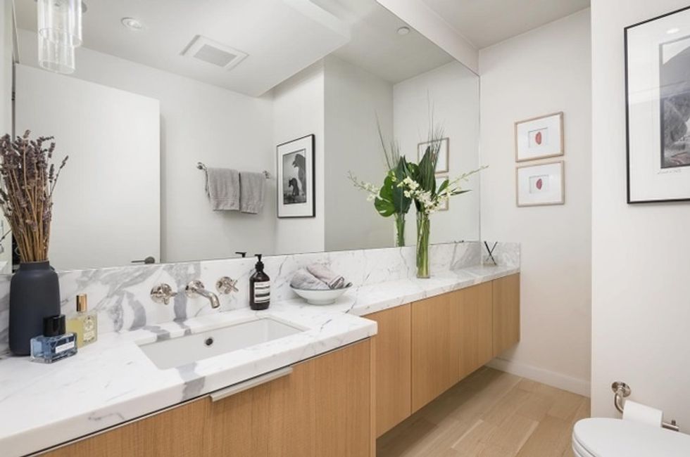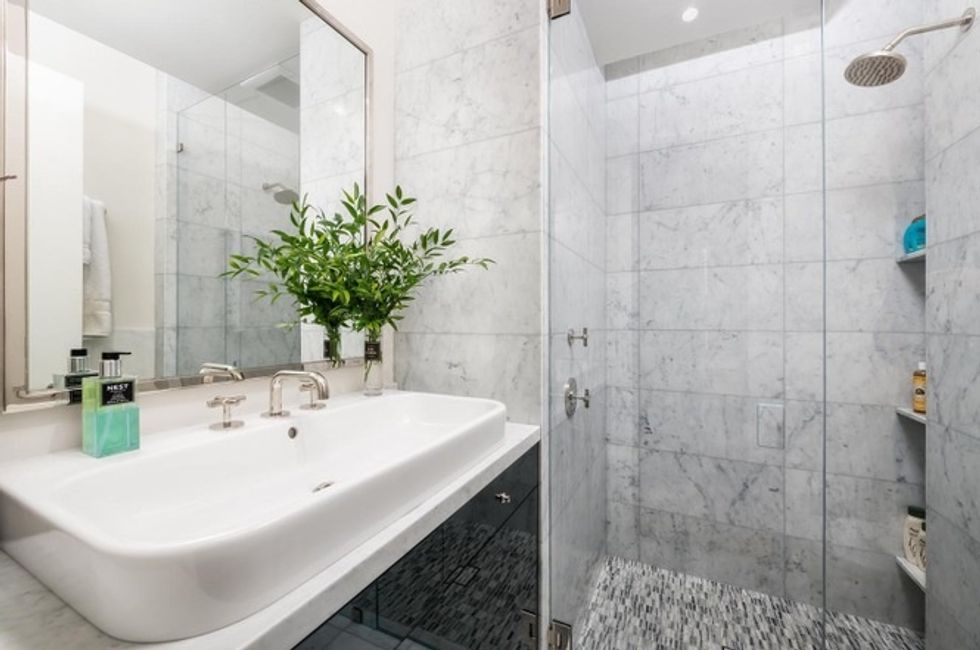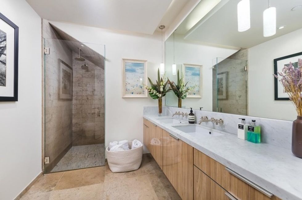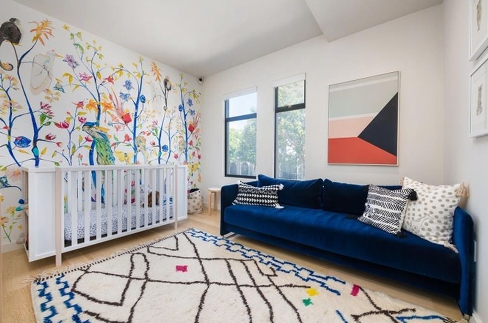 The bedrooms are made stylish with bold wallpapers, and there are Waterworks fixtures and French limestone in the en-suite bathrooms. The master suite, meanwhile, has spa vibes in its bathroom with a sprawling dual-sink marble-and-wood vanity and a large stone shower with multiple shower heads.