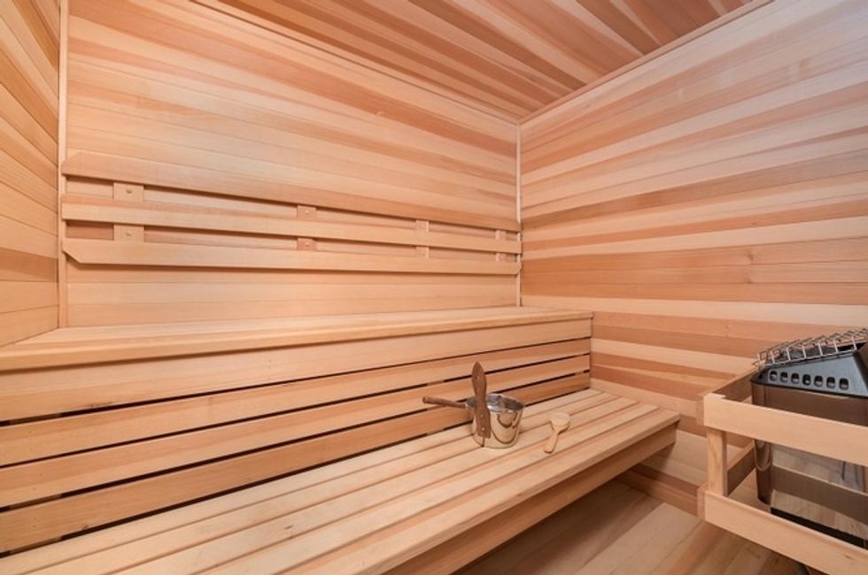 On the lower level, find another bedroom with its own full bathroom and private terrace, as well as a custom six-person sauna with LED controls.