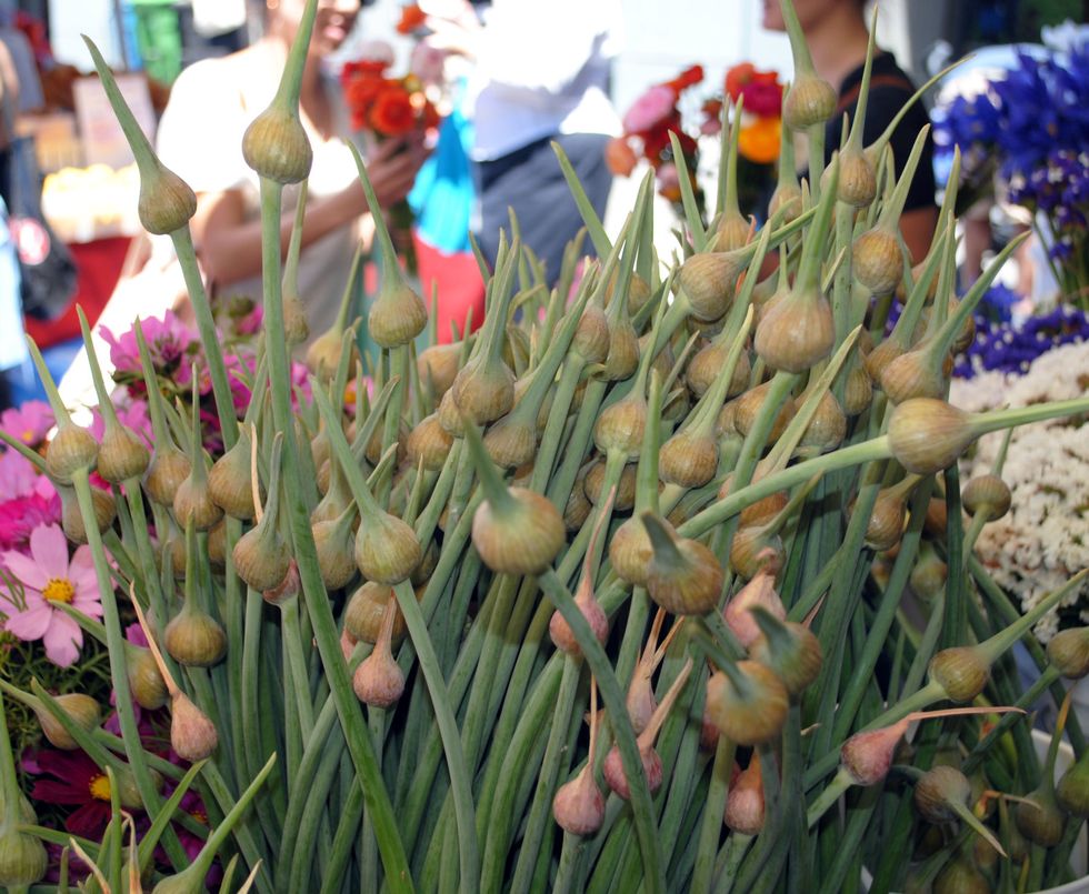 Elephant garlic scapes: To prepare for the harvest of the first Elephant garlic bulbs next month, the crew at Thomas Farm has been thinning out and harvesting the scapes to bring to market. Removing the scapes allows the plant to focus its energy on bulb growth. The scapes have delicious flavor and can be used in a variety of ways, such as sautéed, added to pastas or egg dishes, pickled or made into a pesto. They also make a beautiful addition to flower bouquets.