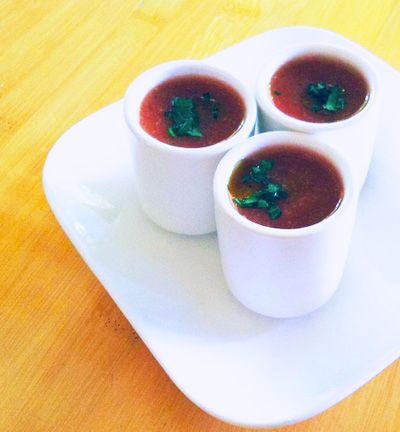 Chef Ben De Vries likes this bright fresh tomato-based start to a summer meal. Plum tomatoes get an added kick from red, green and yellow bell peppers, garlic and cucumber, plus added thickness from a secret technique: bread, pureed into the broth.