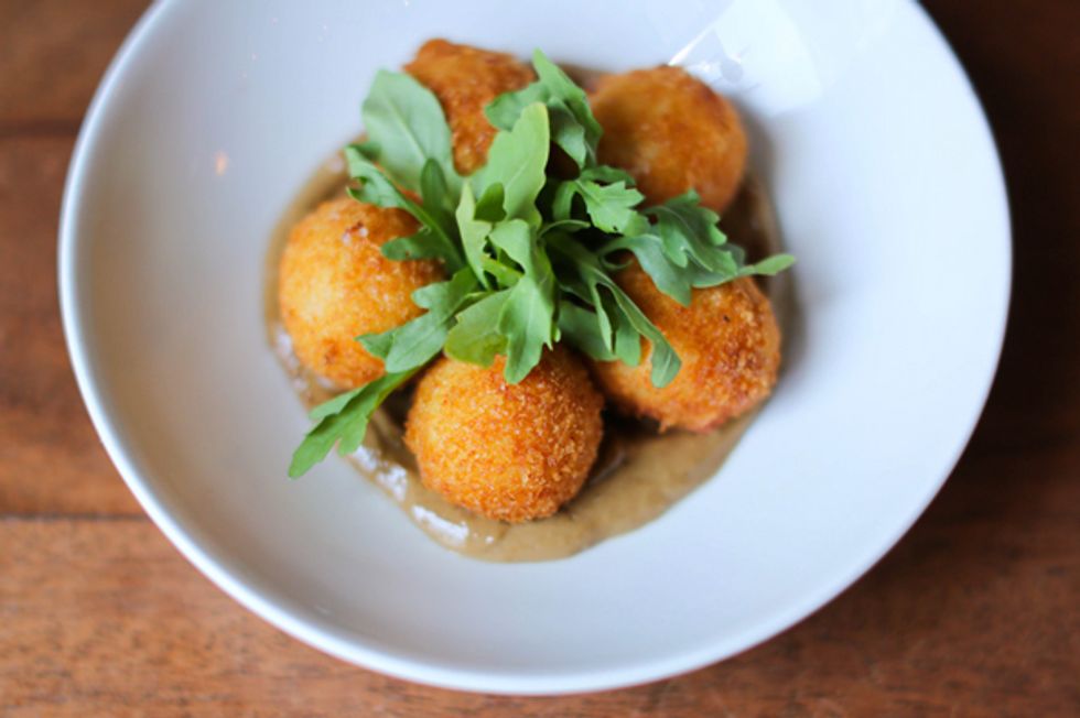 A simple combination of carnaroli rice risotto made with grana and filled with an oozy taleggio center, chef-owner Bruce Hill's arancini are breaded in feathery light panko then fried to crisp in rice bran oil and served with a black garlic aioli.