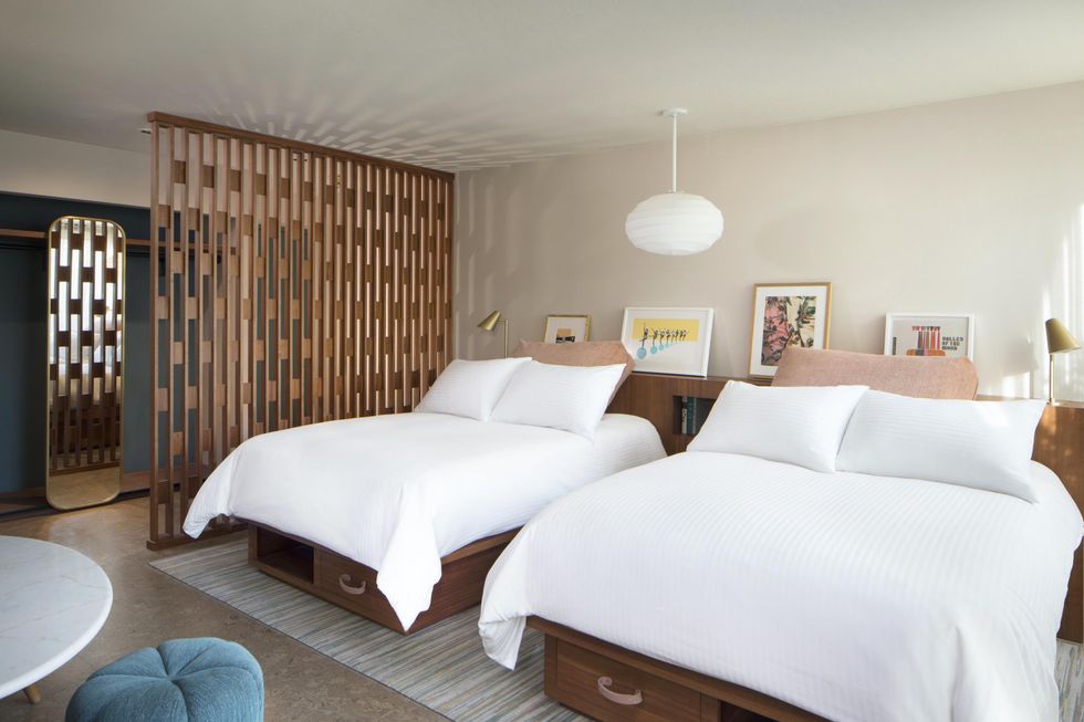 A garden sculpture by Hybycozo marks entrance into the grand porte cochere with vertical wood paneling, a fire pit and lounge seating, and floor-to-ceiling windows that give you a peek out to the pool, the centerpiece of the resort. A mural and a funky fish tank terrarium by SF-based Serge Gay Jr. bring color to the lobby. Five two-story buildings with guest rooms jutting out in star-like formation revolve around the pool and common area.