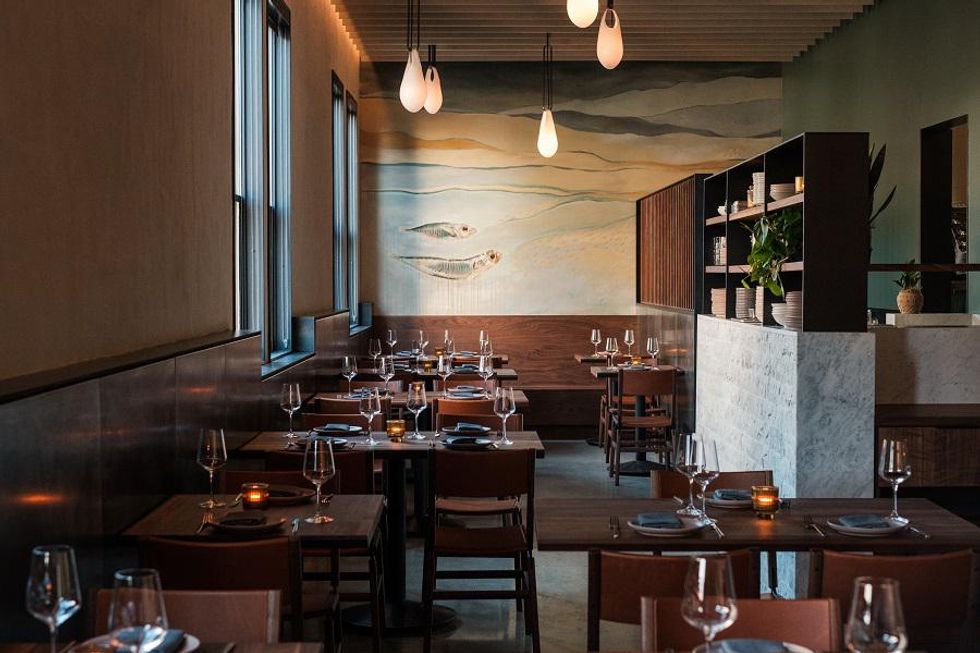 Pendant lanterns, rich walnut chairs and tables, and screens now accessorize the space, along with an Italian marble bar and hand-plastered American clay walls. The original mural on the restaurant’s back wall has been updated to fit the new aesthetic, and a sound baffling ceiling installed to keep the decibel of Flour + Water’s essential playlists from overwhelming the dining room. Even the floors have been completely ground down.
