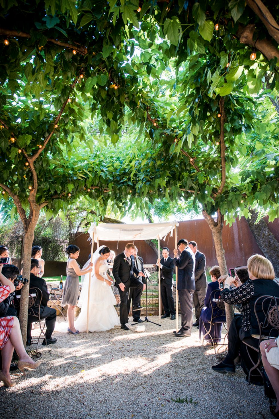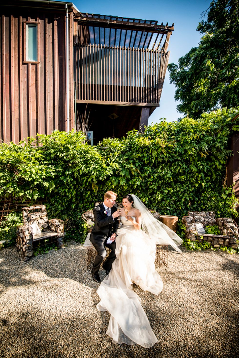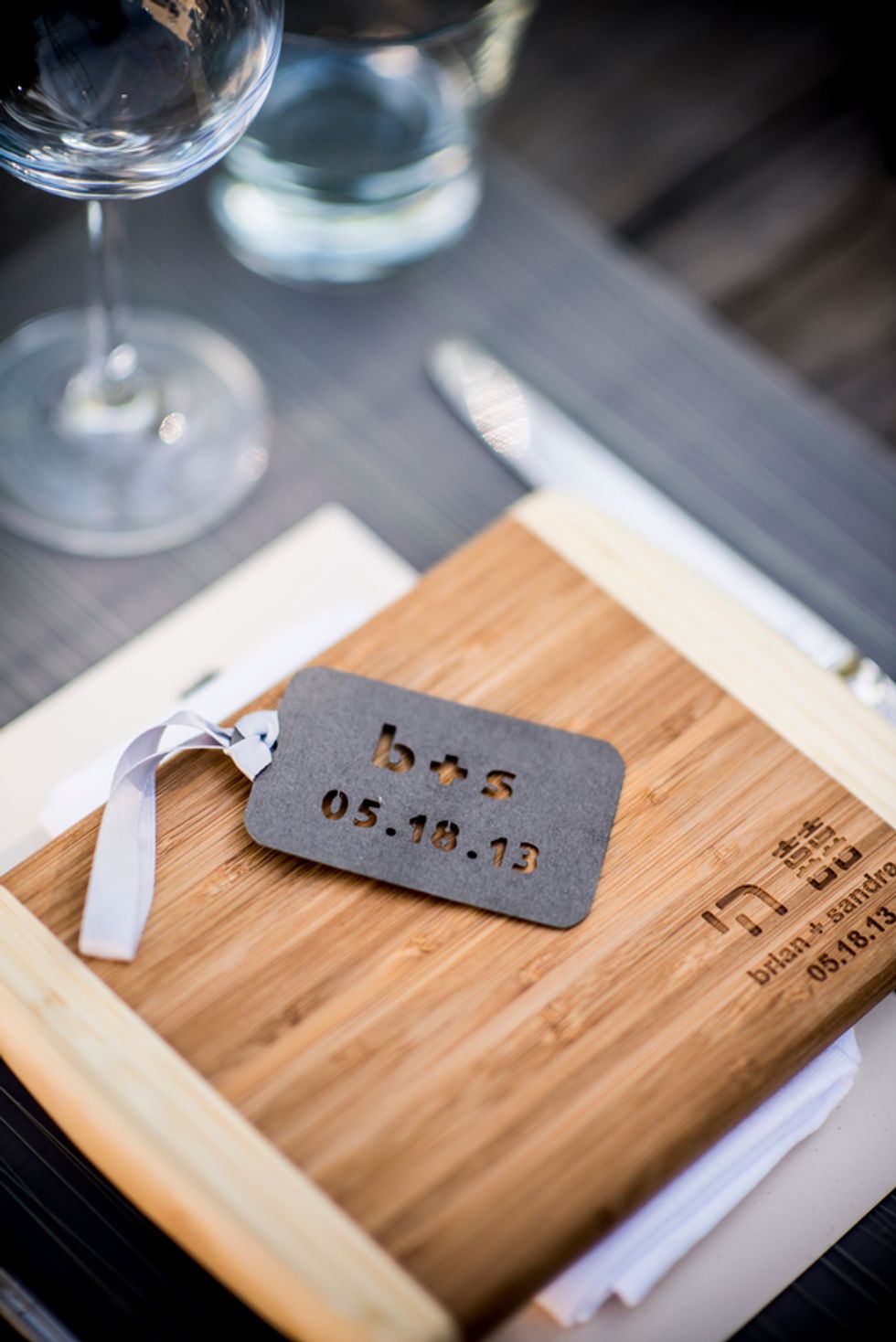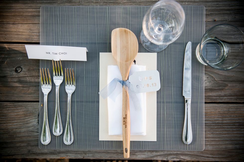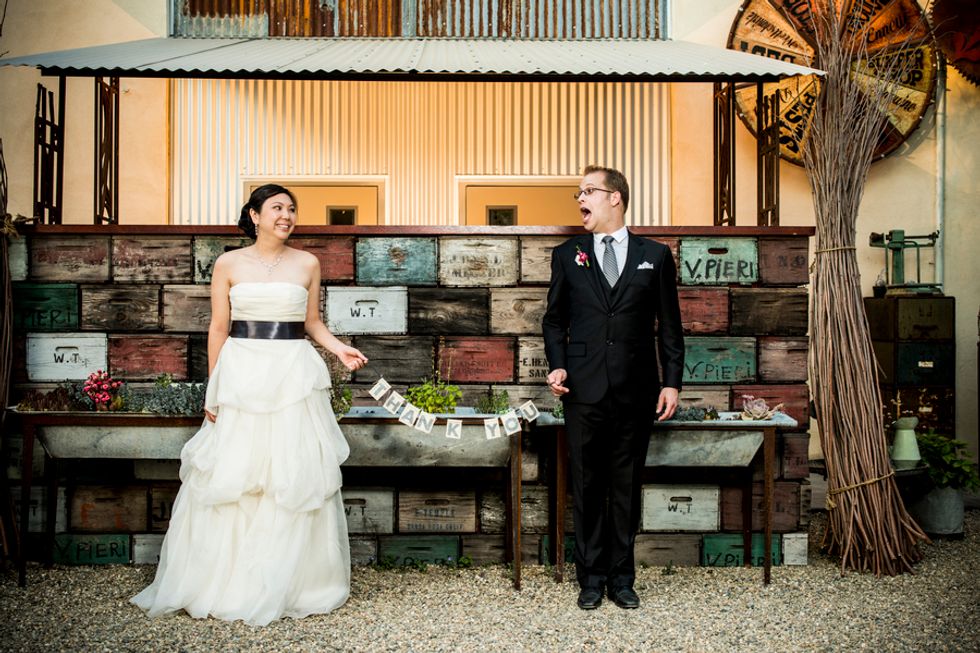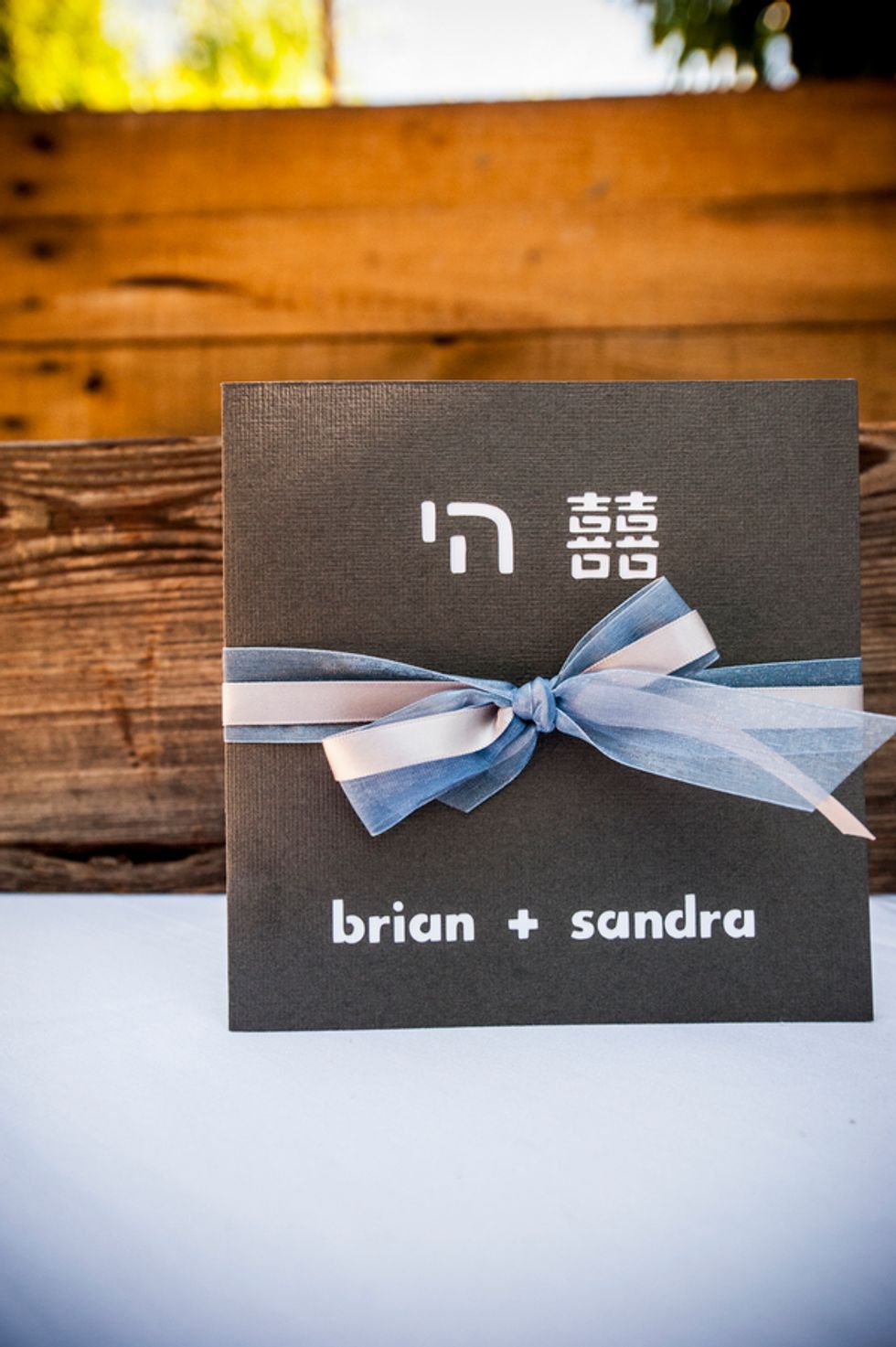 The bride and groom are big food and wine fans (they even make their own wine) so they decided to host their wedding at Barndiva in Healdsburg. Brian and Sandra painted wine bottles with chalkboard paint for kids and guests to write on, and gave out monogramed wooden spoons and cutting boards as favors. The newlyweds also celebrated both of their cultural backgrounds by incorporating parts of Brian's Jewish religion and performing a traditional Asian tea ceremony as well.
