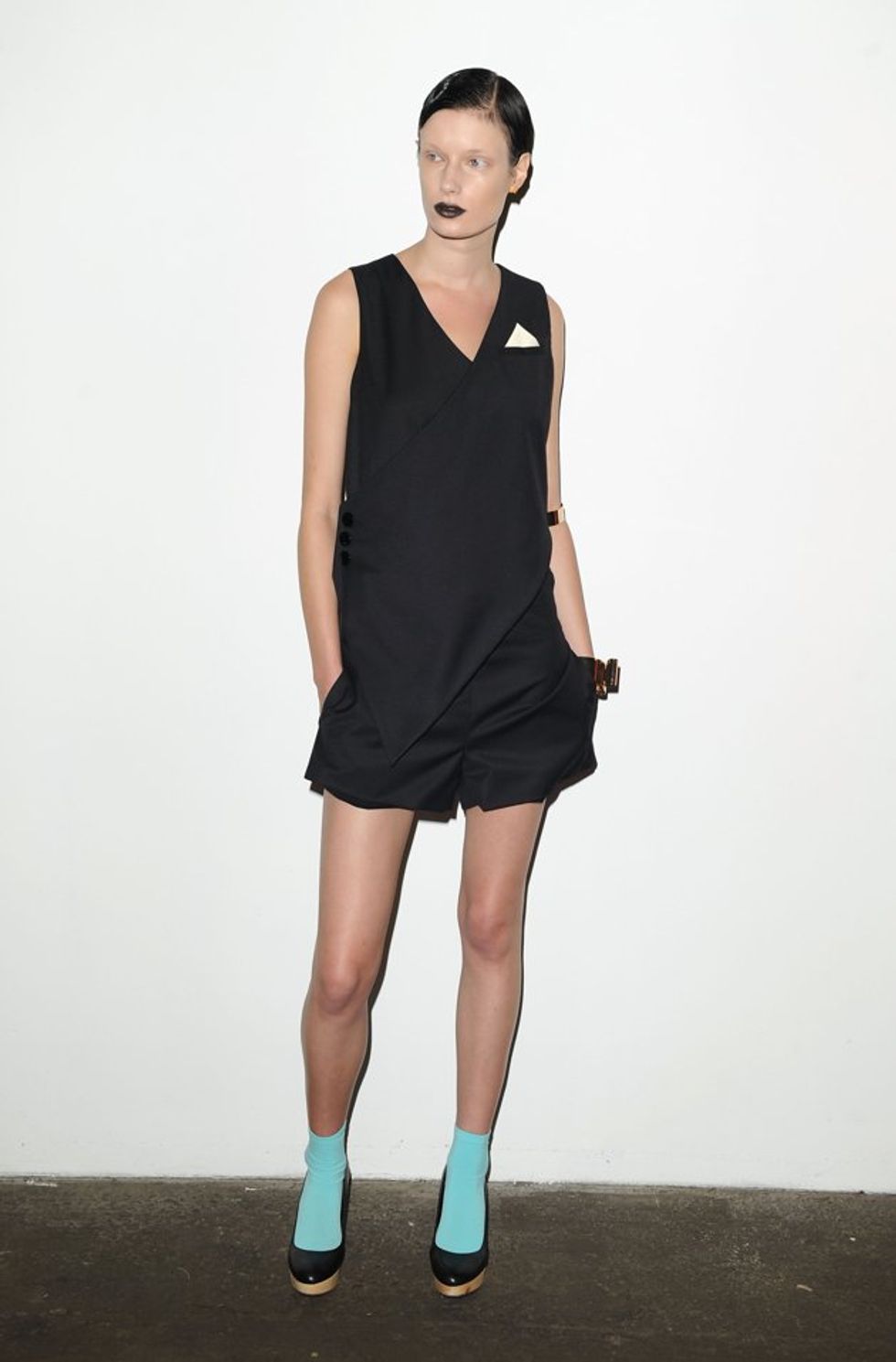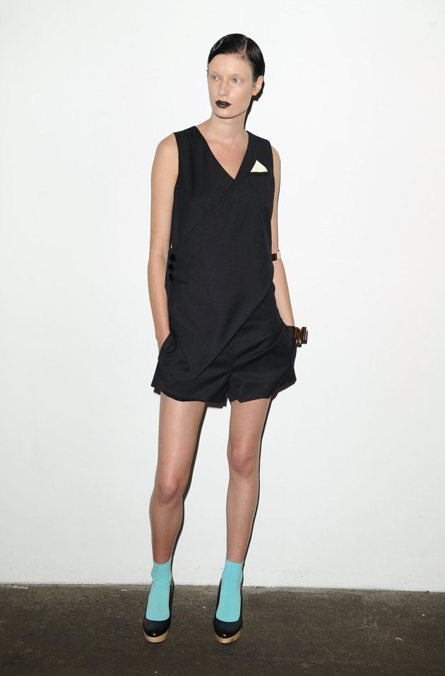 The collection featured a mix of masculine tailoring and feminine silhouettes – structured shorts suits and playful rompers, silky slip dresses and sheer blouses paired with cropped pants. When asked about the woman she designed for, Laricks described a design-conscious customer, looking for something a little different. “Its definitely for someone who enjoys fashion and things that are a little quirky – I can definitely see people on both coasts wearing it.”