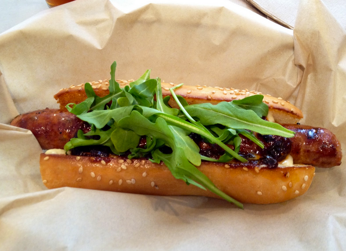 Peter Tempkin's handmade merguez link combines lamb, pork and a hit of North African spice, balanced out with the sweetness of freshly made fig chutney. Order it as a sandwich and you'll get it on a seeded, long, crusty bun with a tuft of arugula and a wash of sweet champagne vinegar-laced mustard. Or get it salad-style: All of Show Dogs' meal-size sausages can be ordered on a dressed bed of arugula if you really want to keep it light.