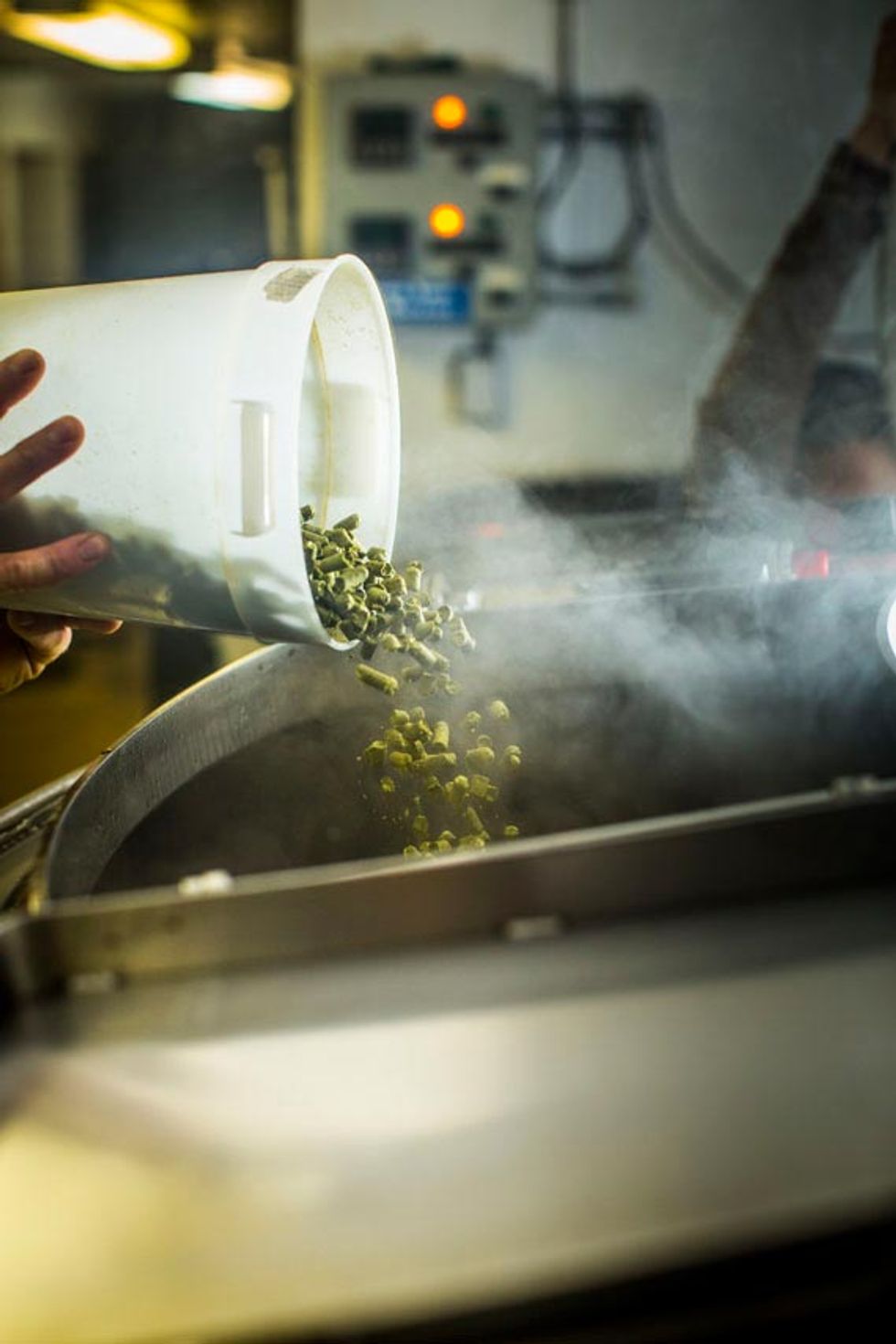 Among his favorites, Bonnie Lee’s Best Bitter is a thirst-quenching homage to English ales, made with heirloom Maris Otter barley that has been malted (sprouted then dried) and kiln toasted. The lightest grain, with a sweet cookie-like aroma, provides a foundation of flavor and sugar (which becomes alcohol during fermentation), while two heavier toasts contribute to its auburn color and complexity. A single variety of Golding hops balances the grain’s sweetness to create the refreshing crispness of a classic English bitter. Seven days of warm fermentation with the house yeast transforms this bittersweet combination (called “wort”) into beer, and then another week resting in a conditioning tank harmonizes the flavors before serving.