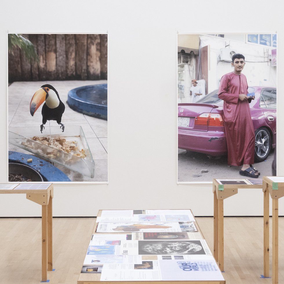 Wolfgang Tillmans, Frank, in the shower, 2015, and young man, Jeddah, 2012, Tukan (Toucan), 2010, with Truth Study Center tables, all installation view SFMOMA, 2023, courtesy the artist, David Zwirner, New York / Hong Kong, Galerie Buchholz, Berlin / Cologne, Maureen Paley, London, photo: Adam Jacobs Photography.