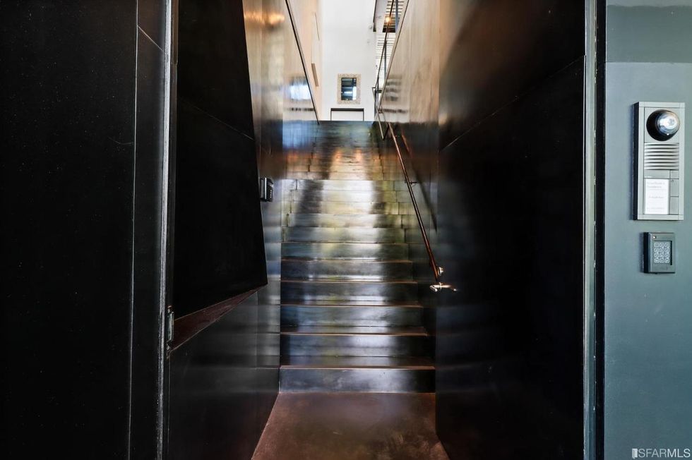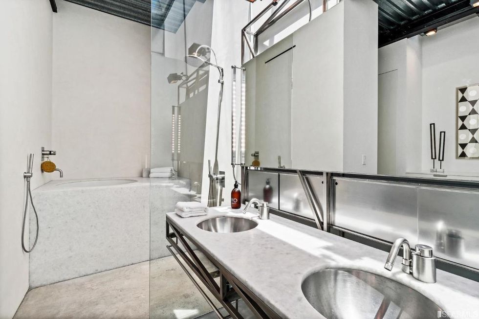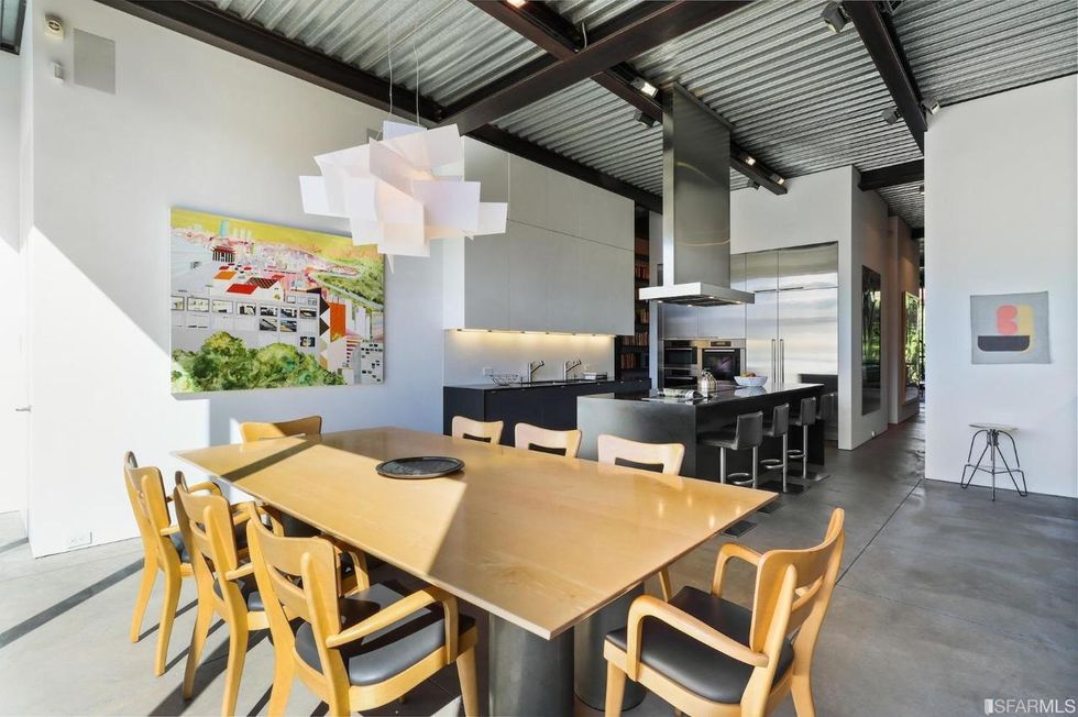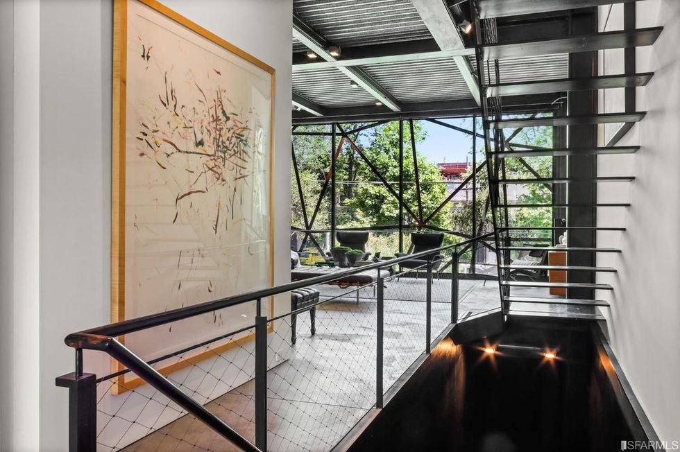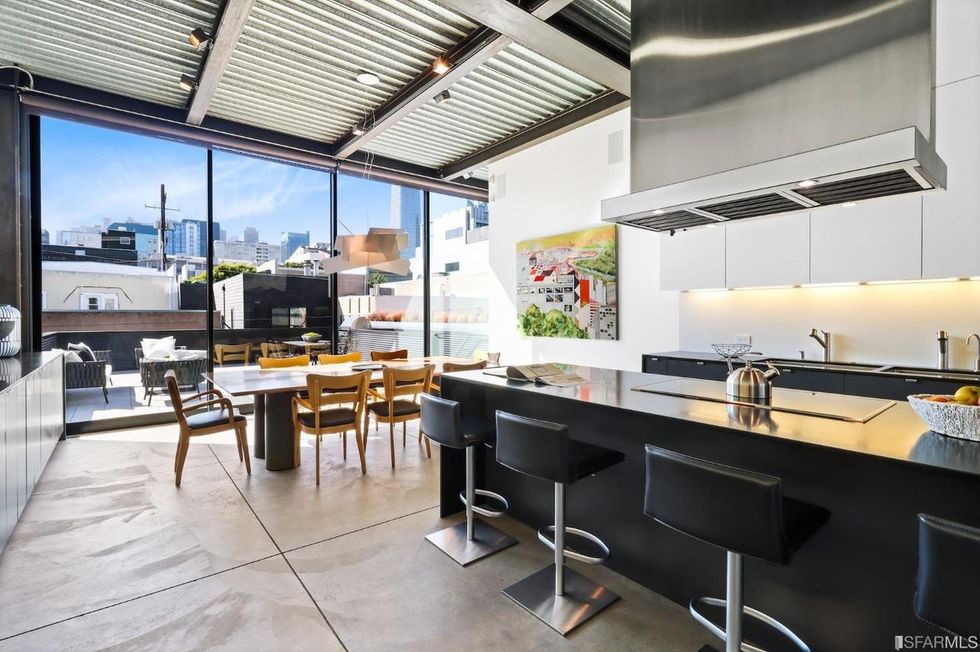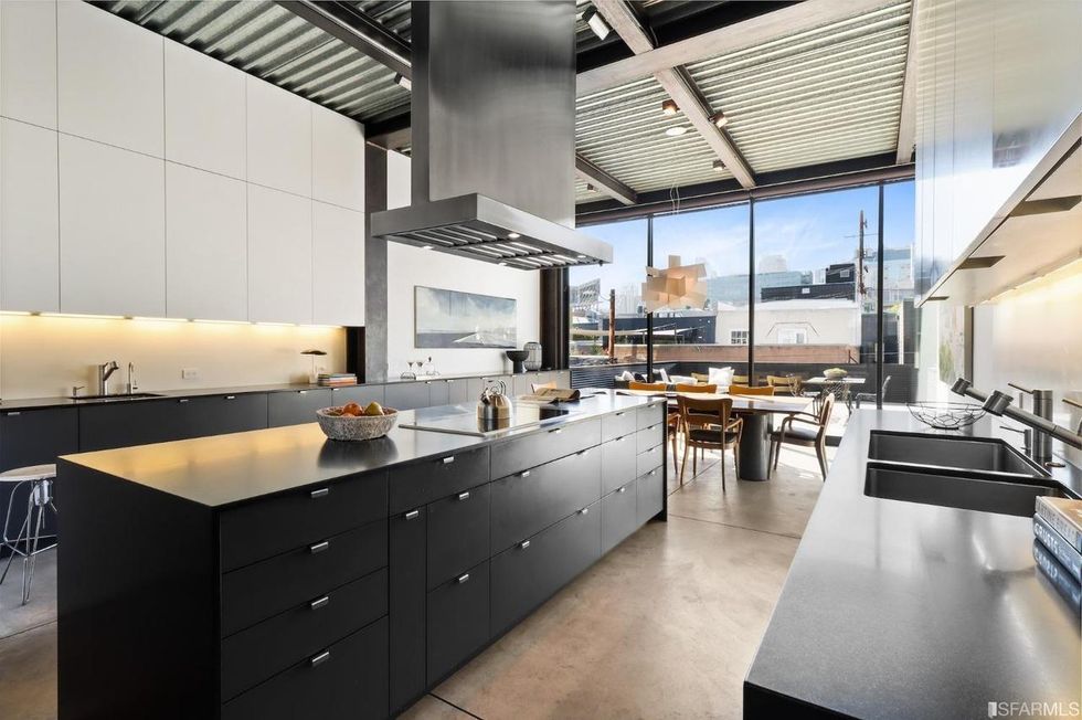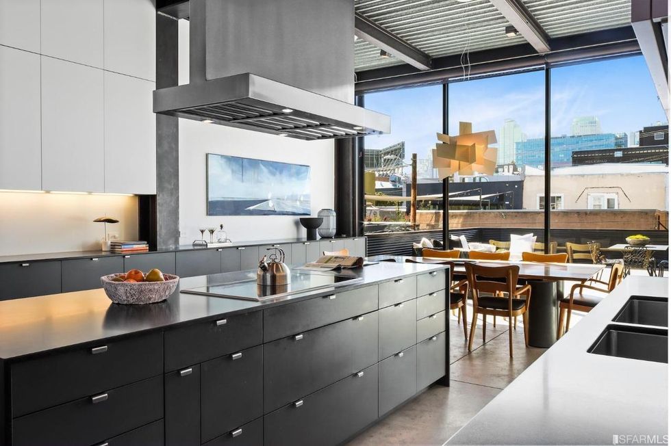 Towering ceilings, poured concrete floors, a steel staircase lend a modern industrial vibe, but elements such as a wine cellar and a thoughtfully equipped chef's kitchen keep the space welcoming for entertaining. Cooks will appreciate the abundance of kitchen storage, two sinks, stainless steel appliances, and a sprawling center island.
