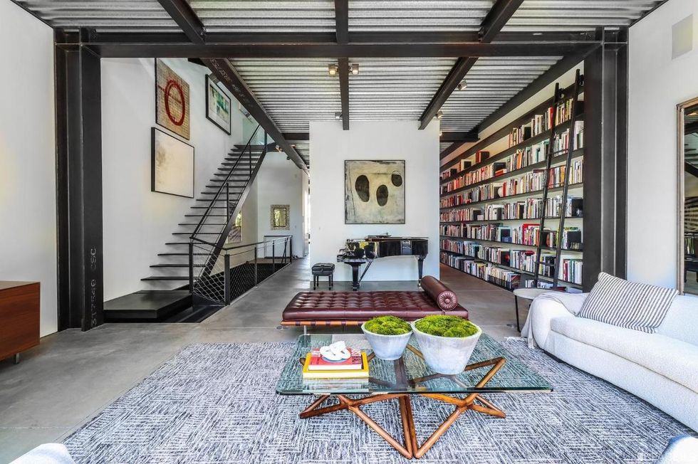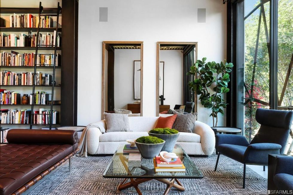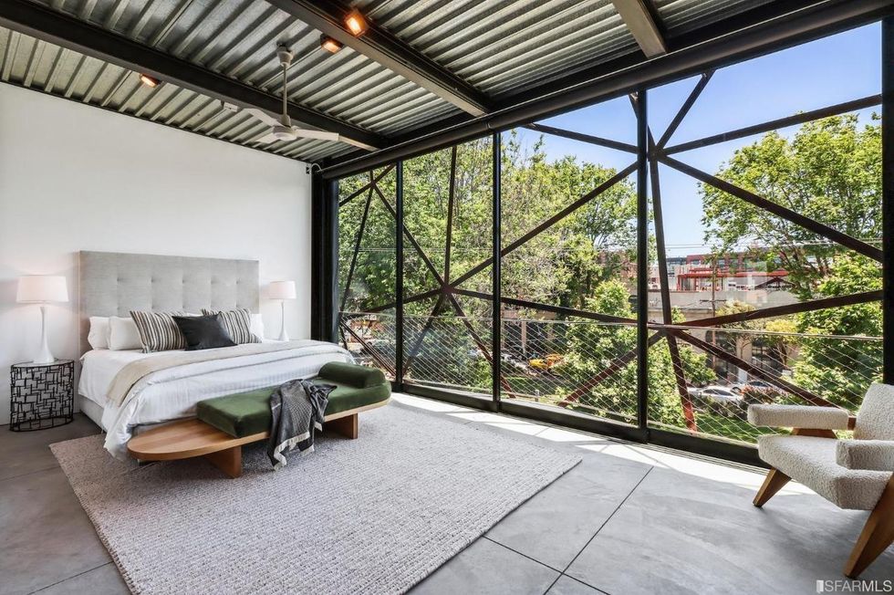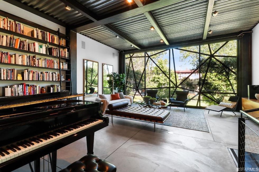 The home's interior is washed in natural light from skylights and floor-to-ceiling windows with views of the park.