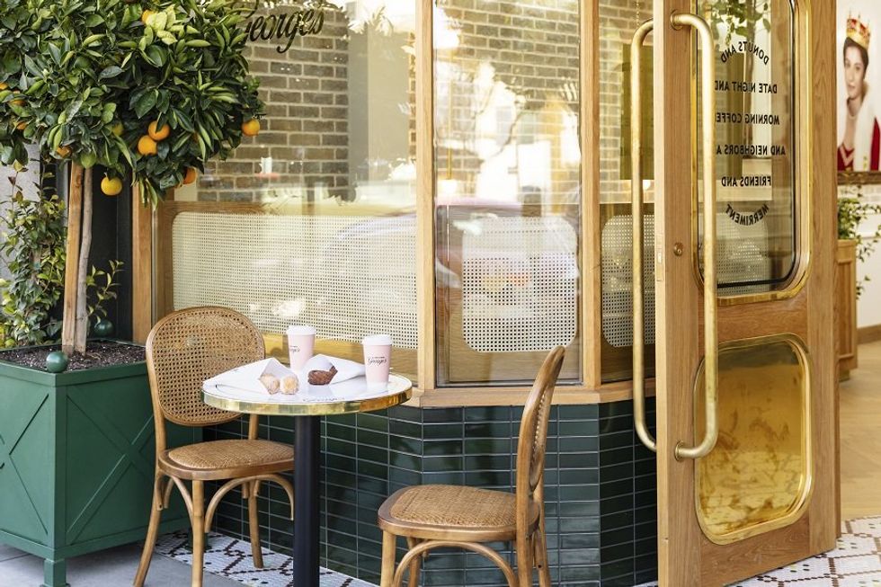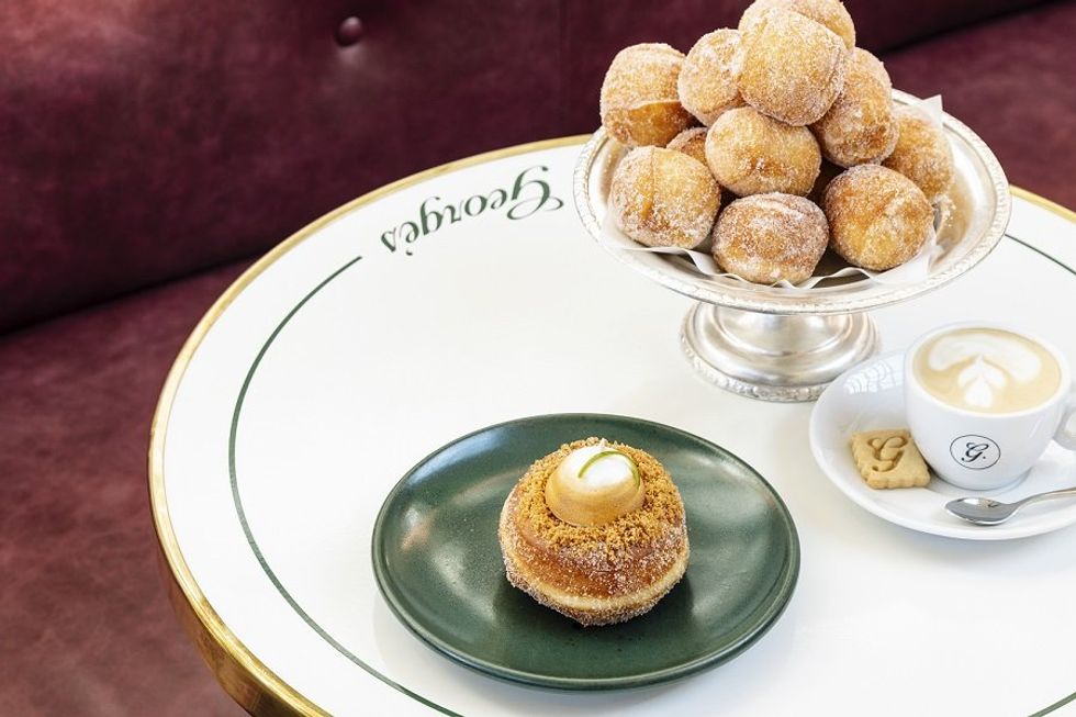 Donuts, believe O’Leary and co-owners Lea and Andrew Dudam, have the magic to bring people together. George’s, the latest addition to what’s unexpectedly become one of SF’s most buzzy neighborhoods, is a reflection of that joy. The Art Deco-era interior, with its 30-foot high ceiling and large overhead skylight, was refashioned by ROY Hospitality with timeless and sophisticated European styling, jewel-toned accents, and pops of whimsy fit for a cafe with the word “merriment” right in its name.