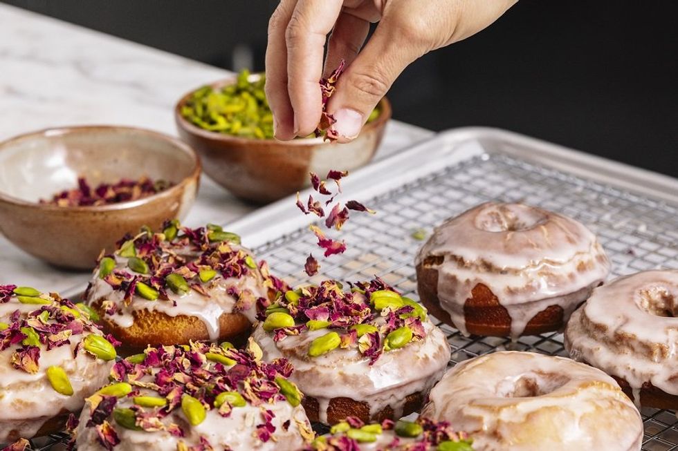 That training comes through in some of the more complex, “elevated” donuts, like the exquisitely tangy key lime pie topped with candied lime and the rich custard-filled creme brulee topped with a crunchy caramelized sugar glaze, fresh raspberries, and flecks of gold. So, too, does O’Leary’s Mexican upbringing, which is currently channeled into an impossibly light churro-dusted cruller. She’s playing around with other ideas for the future—maybe a tequila margarita donut that would be “kind of a spin” on the key lime, maybe a Mexican hot chocolate donut that evokes the cinnamon-laced hot chocolate and buñuelos her aunt used to make—and they’ll pop up seasonally along with homages to Andrew Dudam’s Palestinian upbringing like this first menu’s tahini rose cake donut.