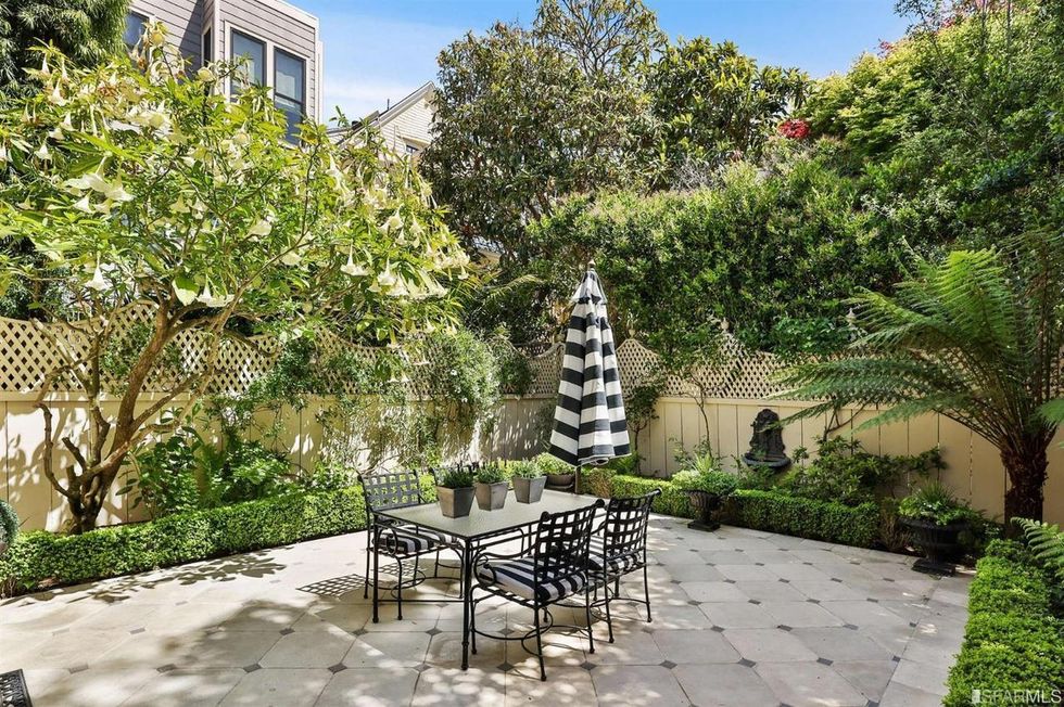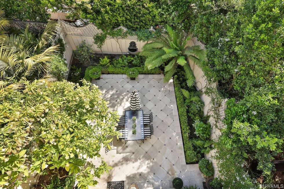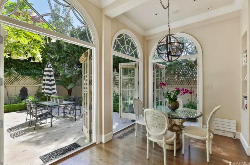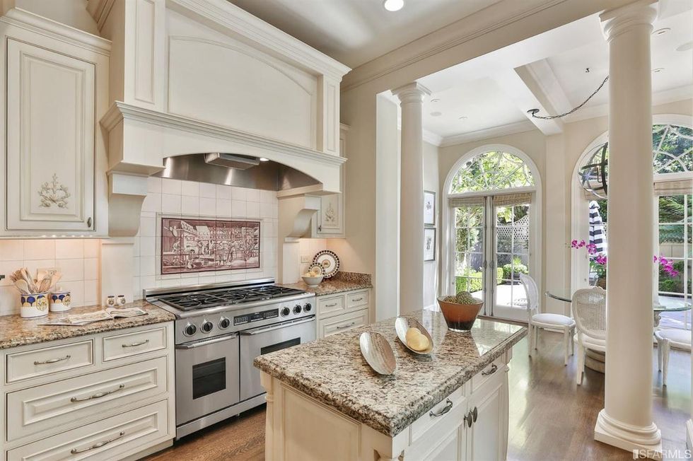 The kitchen is open to the breakfast room, which has three sets of Palladian-style glass doors that flow onto the garden patio with diamond-patterned stone tiles, a carved stone fountain, and fragrant white jasmine.