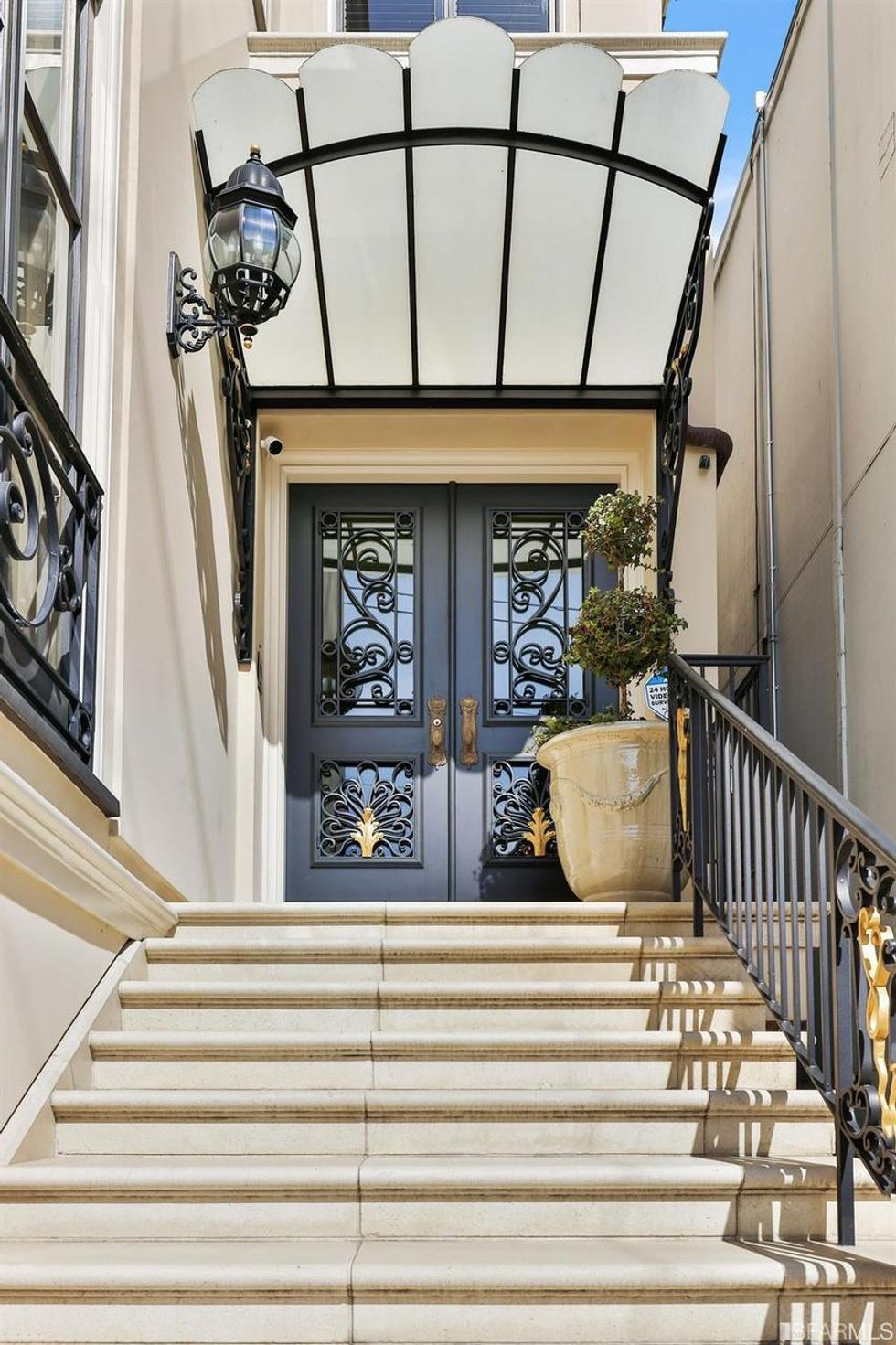 The home's facade stands out on the street with Parisian styling in its wrought iron railings, over-scaled windows, limestone stairway, and a pair of lion statues guarding the front entrance where double doors are shaded by a chic wrought iron and frosted glass awning.