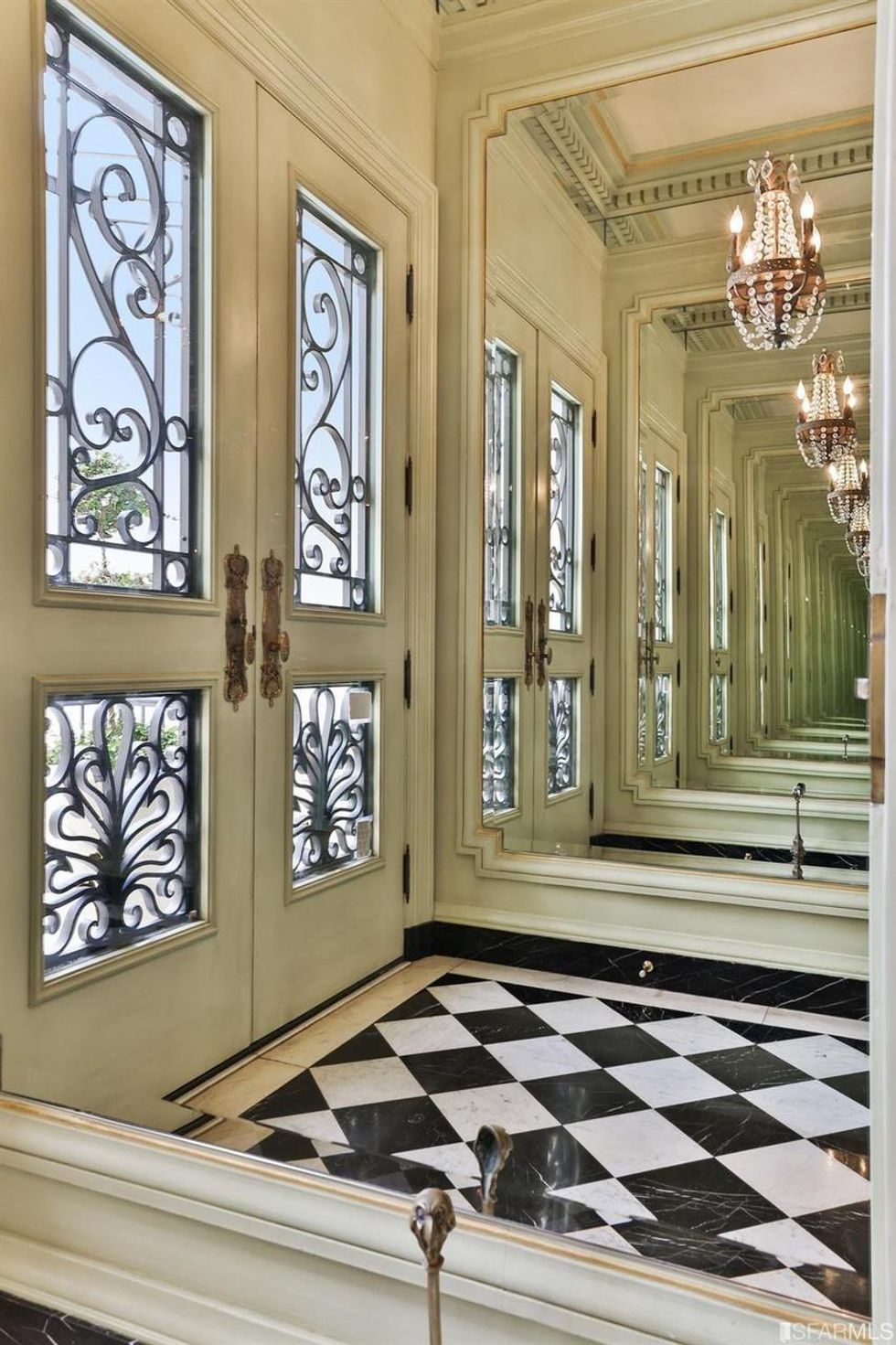 Step through and onto sprawling black-and-white checkered marble floors beneath dentelle and crown moldings and crystal sconces reflected by infinity mirrors. A French chateau-style curved Carrara marble staircase has yet more wrought iron railing and spirals gracefully behind the foyer.