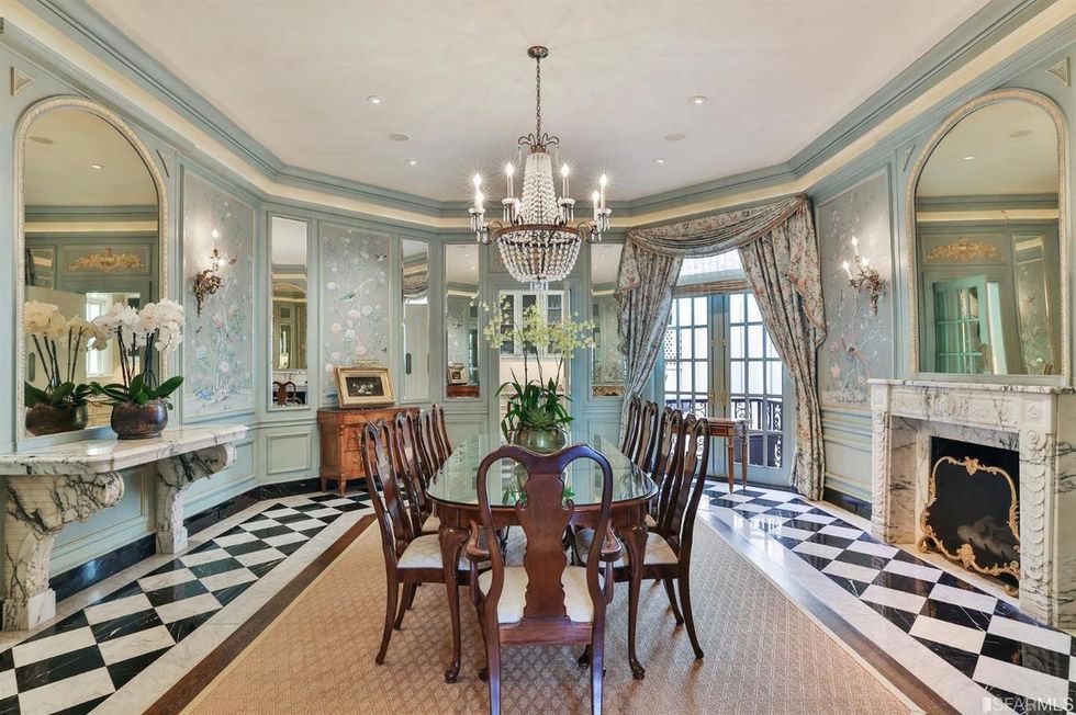 From here, yet another set of French doors leads into an octagonally shaped formal dining room with still more marble flooring and hardwood inlay, another carved marble fireplace, gilt and crystal lighting, and mirrored panels offset by fanciful de Gournay–style wallpaper. The adjacent butler's pantry has an abundance of cabinets and counter space ideal for storage and prep for events, as well as its own sink and a double-door stainless steel Fisher and Paykel dishwasher.