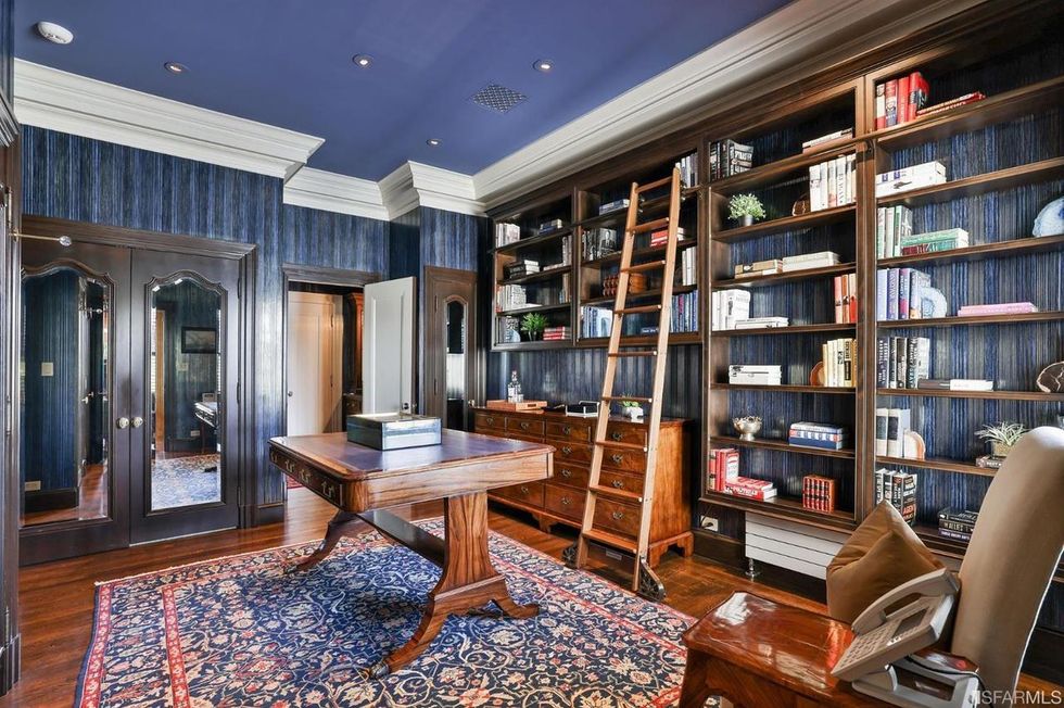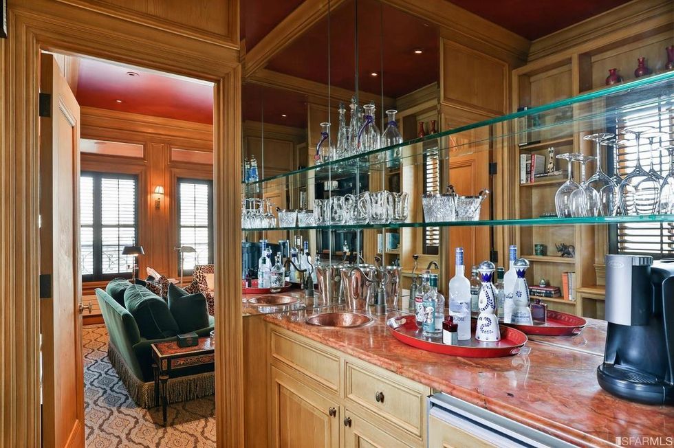 Also on this floor, the wood-and-mirror paneled library is a cozy escape with a marble fireplace of its own as well as a wet bar complete with a copper sink and under-counter fridge.