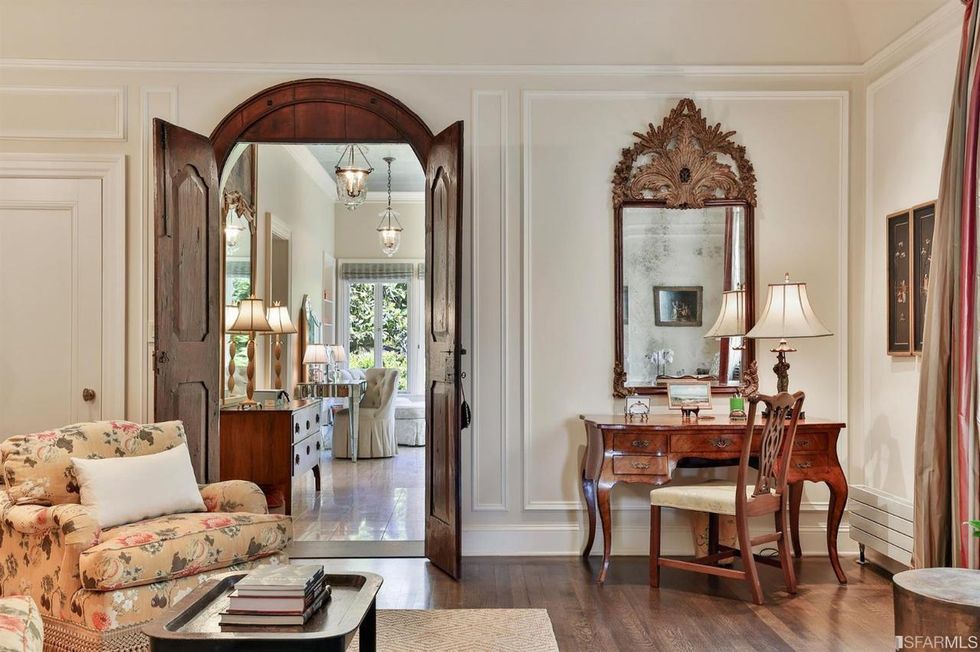 The grand salon—because, yes, houses like these have grand salons—feels fit for entertaining Marie Antoinette with its gold-veined marble fireplace, three sets of French doors, coved ceiling, and opulent crystal chandelier. Just outside is a balcony with a wrought-iron balustrade.